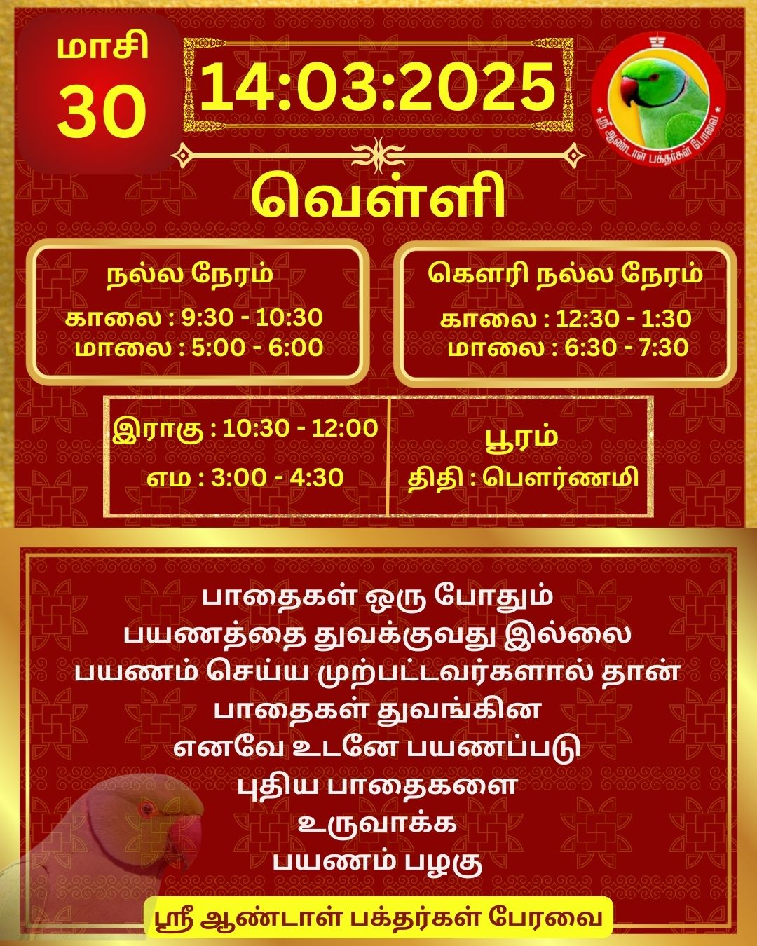 March 14 2025 0CommentSABP Posted by Vastu_Shastram In motivation SABPShare this: Tags: #daily_calender, APC, Calendar, calendar 2025, DAILY, DrAndalPChockalingam, Motivation, motivational quotes, motivational quotes daily, motivationalquotesoftheday, panjangam, SABP, SriAndalBakthargalPeravai, waytosuccess2025, ஆண்டாள், இன்றையநாள், காலண்டர், காலண்டர்2025, தன்னம்பிக்கை, தன்னம்பிக்கை2025, நாட்காட்டி, பஞ்சாங்கம், வாழ்கவளமுடன், ஸ்ரீஆண்டாள்பக்தர்கள்பேரவை Share: