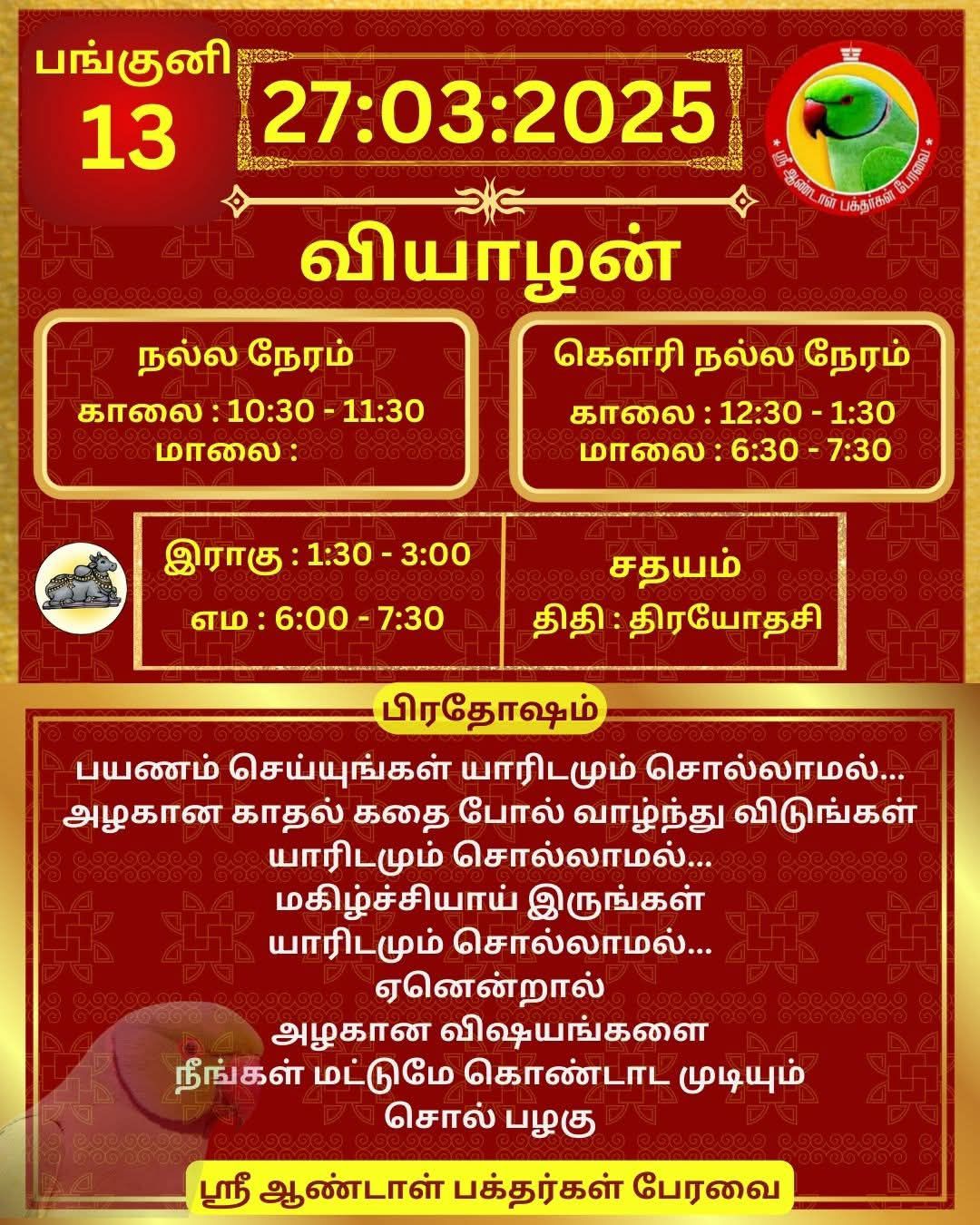 March 27 2025 0CommentSABP Posted by Vastu_Shastram In motivation SABPShare this: Tags: #daily_calender, APC, Calendar, calendar 2025, DAILY, DrAndalPChockalingam, Motivation, motivational quotes, motivational quotes daily, motivationalquotesoftheday, panjangam, SABP, SriAndalBakthargalPeravai, waytosuccess2025, ஆண்டாள், இன்றையநாள், காலண்டர், காலண்டர்2025, தன்னம்பிக்கை, தன்னம்பிக்கை2025, நாட்காட்டி, பஞ்சாங்கம், வாழ்கவளமுடன், ஸ்ரீஆண்டாள்பக்தர்கள்பேரவை Share: