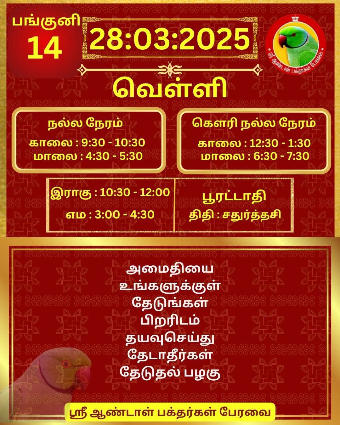 March 28 2025 0CommentSABP Posted by Vastu_Shastram In motivation SABPShare this: Tags: #daily_calender, APC, Calendar, calendar 2025, DAILY, DrAndalPChockalingam, Motivation, motivational quotes, motivational quotes daily, motivationalquotesoftheday, panjangam, SABP, SriAndalBakthargalPeravai, waytosuccess2025, ஆண்டாள், இன்றையநாள், காலண்டர், காலண்டர்2025, தன்னம்பிக்கை, தன்னம்பிக்கை2025, நாட்காட்டி, பஞ்சாங்கம், வாழ்கவளமுடன், ஸ்ரீஆண்டாள்பக்தர்கள்பேரவை Share: