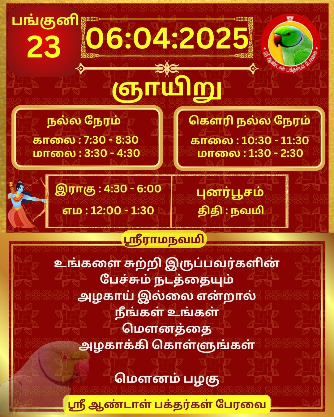 April 06 2025 0CommentSABP Posted by Vastu_Shastram In motivation SABPShare this: Tags: #daily_calender, APC, Calendar, calendar 2025, DAILY, DrAndalPChockalingam, Motivation, motivational quotes, motivational quotes daily, motivationalquotesoftheday, panjangam, SABP, SriAndalBakthargalPeravai, waytosuccess2025, ஆண்டாள், இன்றையநாள், காலண்டர், காலண்டர்2025, தன்னம்பிக்கை, தன்னம்பிக்கை2025, நாட்காட்டி, பஞ்சாங்கம், வாழ்கவளமுடன், ஸ்ரீஆண்டாள்பக்தர்கள்பேரவை Share: