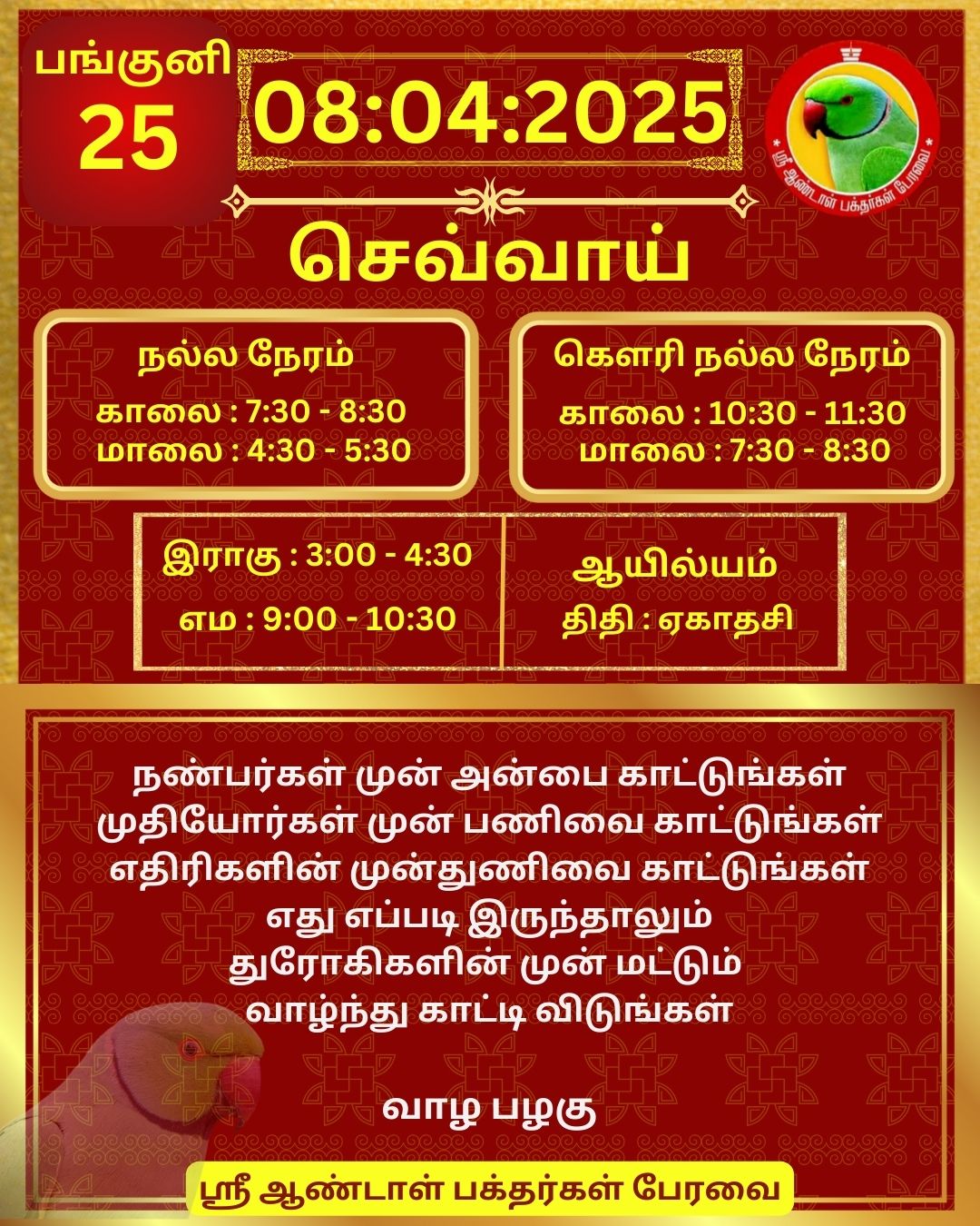April 08 2025 0CommentSABP Posted by Vastu_Shastram In motivation SABPShare this: Tags: #daily_calender, APC, Calendar, calendar 2025, DAILY, DrAndalPChockalingam, Motivation, motivational quotes, motivational quotes daily, motivationalquotesoftheday, panjangam, SABP, SriAndalBakthargalPeravai, waytosuccess2025, ஆண்டாள், இன்றையநாள், காலண்டர், காலண்டர்2025, தன்னம்பிக்கை, தன்னம்பிக்கை2025, நாட்காட்டி, பஞ்சாங்கம், வாழ்கவளமுடன், ஸ்ரீஆண்டாள்பக்தர்கள்பேரவை Share:
