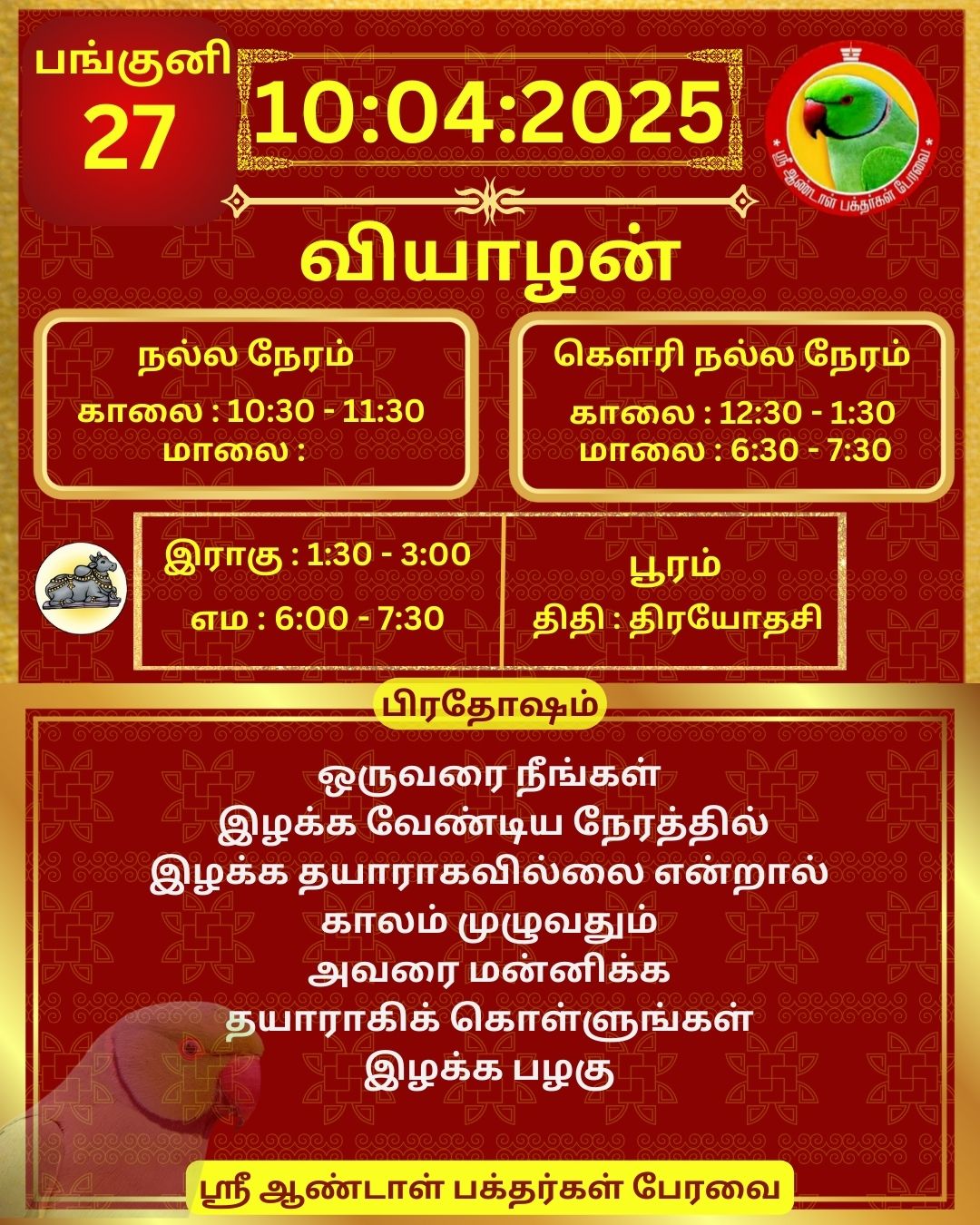 April 10 2025 0CommentSABP Posted by Vastu_Shastram In motivation SABPShare this: Tags: #daily_calender, APC, Calendar, calendar 2025, DAILY, DrAndalPChockalingam, Motivation, motivational quotes, motivational quotes daily, motivationalquotesoftheday, panjangam, SABP, SriAndalBakthargalPeravai, waytosuccess2025, ஆண்டாள், இன்றையநாள், காலண்டர், காலண்டர்2025, தன்னம்பிக்கை, தன்னம்பிக்கை2025, நாட்காட்டி, பஞ்சாங்கம், வாழ்கவளமுடன், ஸ்ரீஆண்டாள்பக்தர்கள்பேரவை Share:
