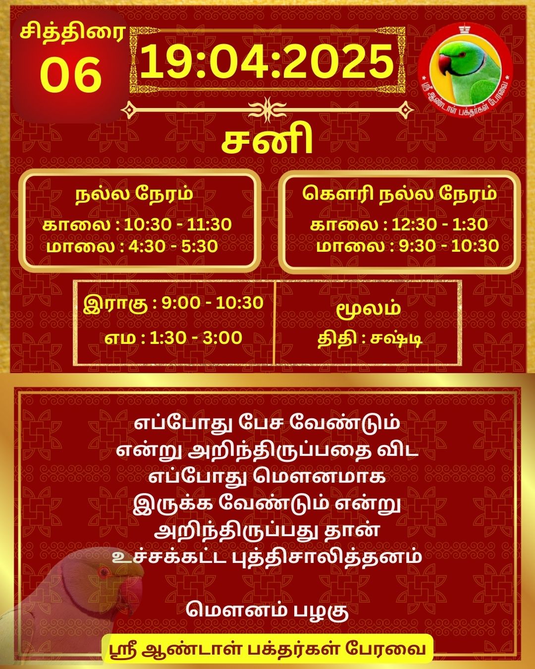 April 19 2025 0CommentSABP Posted by Vastu_Shastram In motivation SABPShare this: Tags: #daily_calender, APC, Calendar, calendar 2025, DAILY, DrAndalPChockalingam, Motivation, motivational quotes, motivational quotes daily, motivationalquotesoftheday, panjangam, SABP, SriAndalBakthargalPeravai, waytosuccess2025, ஆண்டாள், இன்றையநாள், காலண்டர், காலண்டர்2025, தன்னம்பிக்கை, தன்னம்பிக்கை2025, நாட்காட்டி, பஞ்சாங்கம், வாழ்கவளமுடன், ஸ்ரீஆண்டாள்பக்தர்கள்பேரவை Share: