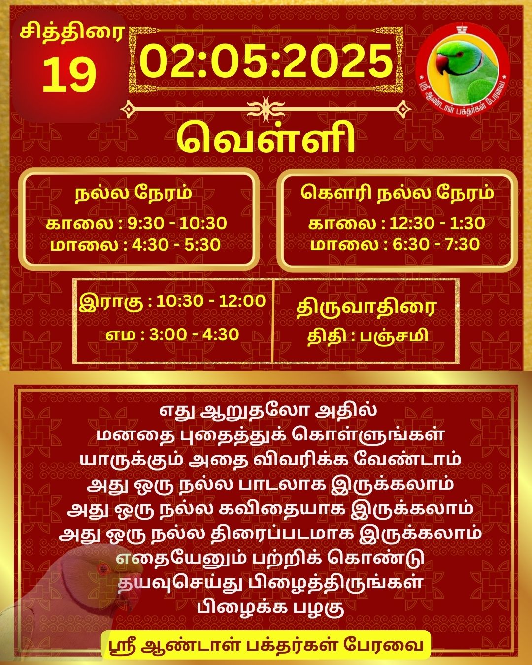 May 02 2025 0CommentSABP Posted by Vastu_Shastram In motivation SABPShare this: Tags: #daily_calender, APC, Calendar, calendar 2025, DAILY, DrAndalPChockalingam, Motivation, motivational quotes, motivational quotes daily, motivationalquotesoftheday, panjangam, SABP, SriAndalBakthargalPeravai, waytosuccess2025, ஆண்டாள், இன்றையநாள், காலண்டர், காலண்டர்2025, தன்னம்பிக்கை, தன்னம்பிக்கை2025, நாட்காட்டி, பஞ்சாங்கம், வாழ்கவளமுடன், ஸ்ரீஆண்டாள்பக்தர்கள்பேரவை Share: