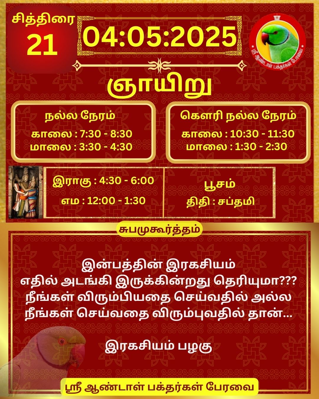 May 04 2025 0CommentSABP Posted by Vastu_Shastram In motivation SABPShare this: Tags: #daily_calender, APC, Calendar, calendar 2025, DAILY, DrAndalPChockalingam, Motivation, motivational quotes, motivational quotes daily, motivationalquotesoftheday, panjangam, SABP, SriAndalBakthargalPeravai, waytosuccess2025, ஆண்டாள், இன்றையநாள், காலண்டர், காலண்டர்2025, தன்னம்பிக்கை, தன்னம்பிக்கை2025, நாட்காட்டி, பஞ்சாங்கம், வாழ்கவளமுடன், ஸ்ரீஆண்டாள்பக்தர்கள்பேரவை Share:
