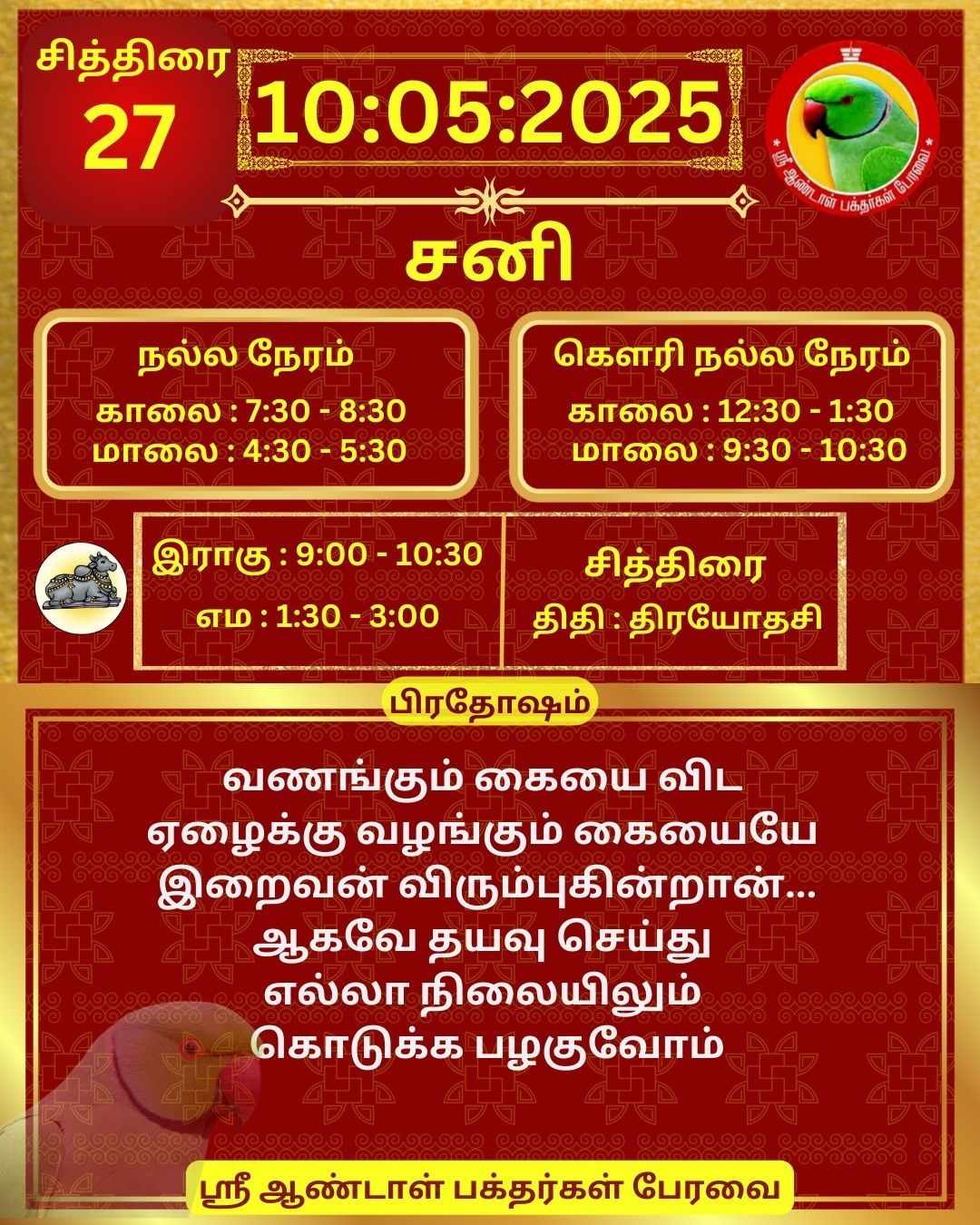 May 10 2025 0CommentSABP Posted by Vastu_Shastram In motivation SABPShare this: Tags: #daily_calender, APC, Calendar, calendar 2025, DAILY, DrAndalPChockalingam, Motivation, motivational quotes, motivational quotes daily, motivationalquotesoftheday, panjangam, SABP, SriAndalBakthargalPeravai, waytosuccess2025, ஆண்டாள், இன்றையநாள், காலண்டர், காலண்டர்2025, தன்னம்பிக்கை, தன்னம்பிக்கை2025, நாட்காட்டி, பஞ்சாங்கம், வாழ்கவளமுடன், ஸ்ரீஆண்டாள்பக்தர்கள்பேரவை Share: