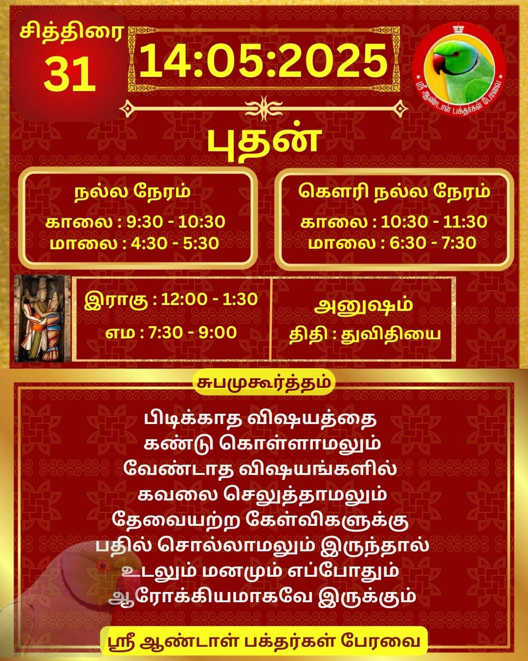 May 14 2025 0CommentSABP Posted by Vastu_Shastram In motivation SABPShare this: Tags: #daily_calender, APC, Calendar, calendar 2025, DAILY, DrAndalPChockalingam, Motivation, motivational quotes, motivational quotes daily, motivationalquotesoftheday, panjangam, SABP, SriAndalBakthargalPeravai, waytosuccess2025, ஆண்டாள், இன்றையநாள், காலண்டர், காலண்டர்2025, தன்னம்பிக்கை, தன்னம்பிக்கை2025, நாட்காட்டி, பஞ்சாங்கம், வாழ்கவளமுடன், ஸ்ரீஆண்டாள்பக்தர்கள்பேரவை Share: