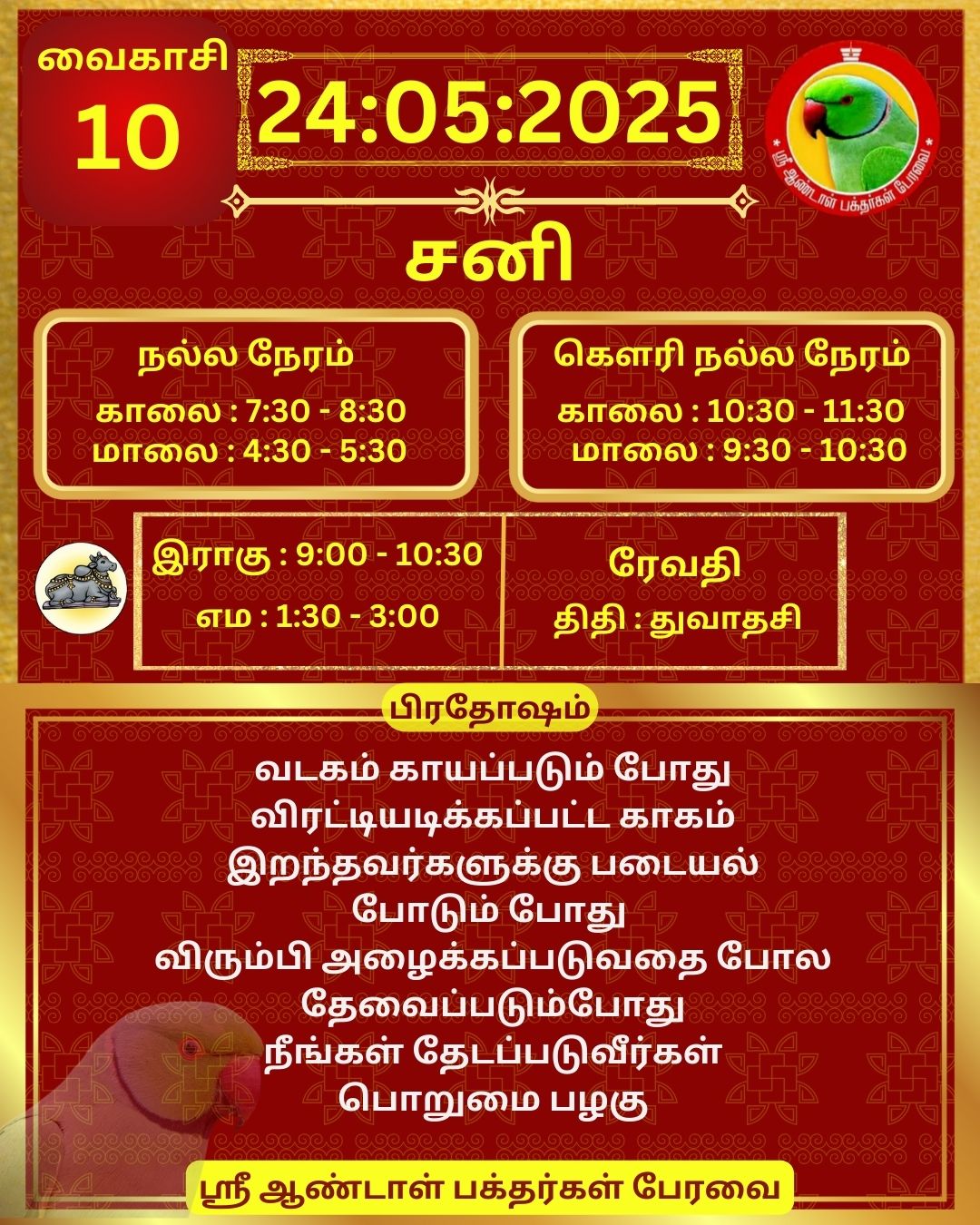 May 24 2025 0CommentSABP Posted by Vastu_Shastram In motivation SABPShare this: Tags: #daily_calender, APC, Calendar, calendar 2025, DAILY, DrAndalPChockalingam, Motivation, motivational quotes, motivational quotes daily, motivationalquotesoftheday, panjangam, SABP, SriAndalBakthargalPeravai, waytosuccess2025, ஆண்டாள், இன்றையநாள், காலண்டர், காலண்டர்2025, தன்னம்பிக்கை, தன்னம்பிக்கை2025, நாட்காட்டி, பஞ்சாங்கம், வாழ்கவளமுடன், ஸ்ரீஆண்டாள்பக்தர்கள்பேரவை Share: