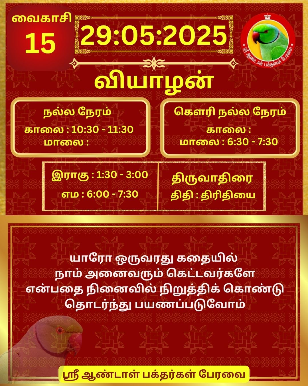 May 29 2025 0CommentSABP Posted by Vastu_Shastram In motivation SABPShare this: Tags: #daily_calender, APC, Calendar, calendar 2025, DAILY, DrAndalPChockalingam, Motivation, motivational quotes, motivational quotes daily, motivationalquotesoftheday, panjangam, SABP, SriAndalBakthargalPeravai, waytosuccess2025, ஆண்டாள், இன்றையநாள், காலண்டர், காலண்டர்2025, தன்னம்பிக்கை, தன்னம்பிக்கை2025, நாட்காட்டி, பஞ்சாங்கம், வாழ்கவளமுடன், ஸ்ரீஆண்டாள்பக்தர்கள்பேரவை Share: