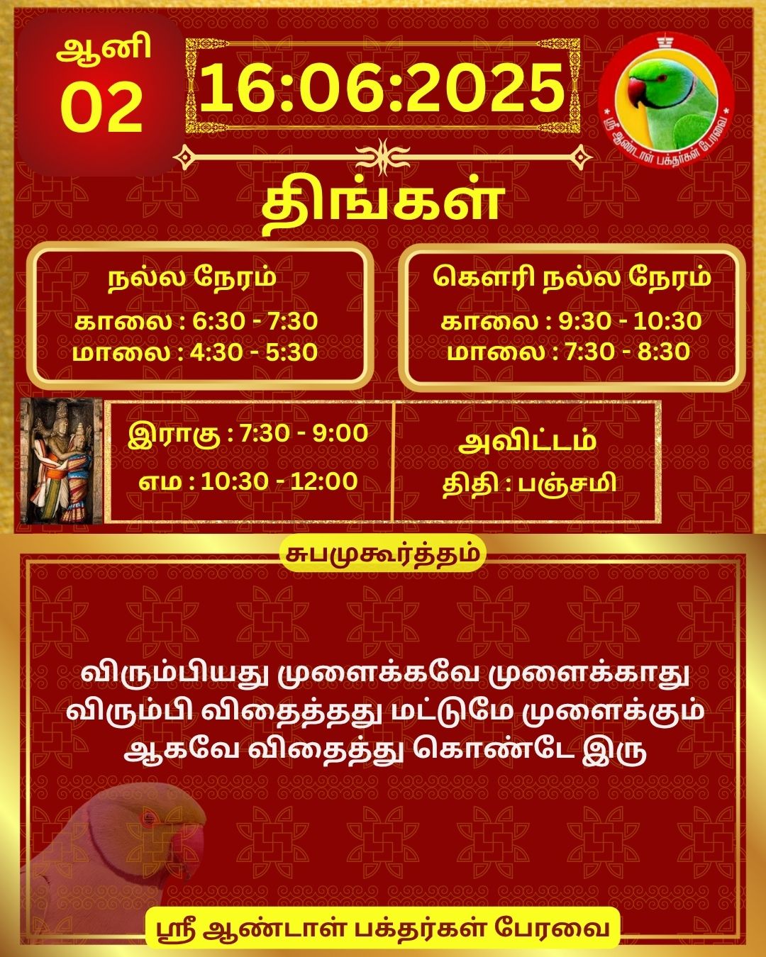 June 16 2025 0CommentSABP Posted by Vastu_Shastram In motivation SABPShare this: Tags: #daily_calender, APC, Calendar, calendar 2025, DAILY, DrAndalPChockalingam, Motivation, motivational quotes, motivational quotes daily, motivationalquotesoftheday, panjangam, SABP, SriAndalBakthargalPeravai, waytosuccess2025, ஆண்டாள், இன்றையநாள், காலண்டர், காலண்டர்2025, தன்னம்பிக்கை, தன்னம்பிக்கை2025, நாட்காட்டி, பஞ்சாங்கம், வாழ்கவளமுடன், ஸ்ரீஆண்டாள்பக்தர்கள்பேரவை Share:
