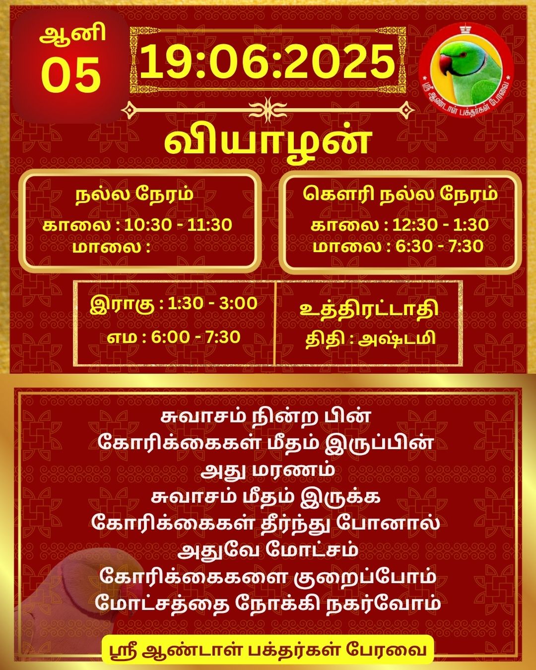 June 19 2025 0CommentSABP Posted by Vastu_Shastram In motivation SABPShare this: Tags: #daily_calender, APC, Calendar, calendar 2025, DAILY, DrAndalPChockalingam, Motivation, motivational quotes, motivational quotes daily, motivationalquotesoftheday, panjangam, SABP, SriAndalBakthargalPeravai, waytosuccess2025, ஆண்டாள், இன்றையநாள், காலண்டர், காலண்டர்2025, தன்னம்பிக்கை, தன்னம்பிக்கை2025, நாட்காட்டி, பஞ்சாங்கம், வாழ்கவளமுடன், ஸ்ரீஆண்டாள்பக்தர்கள்பேரவை Share: