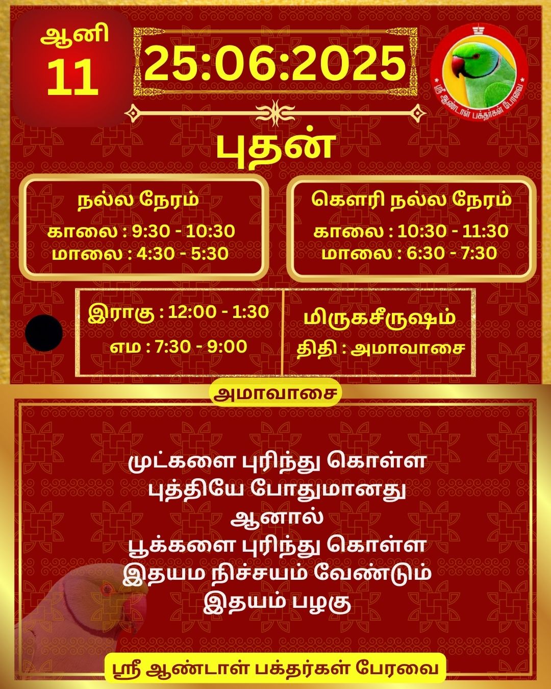 June 25 2025 0CommentSABP Posted by Vastu_Shastram In motivation SABPShare this: Tags: #daily_calender, APC, Calendar, calendar 2025, DAILY, DrAndalPChockalingam, Motivation, motivational quotes, motivational quotes daily, motivationalquotesoftheday, panjangam, SABP, SriAndalBakthargalPeravai, waytosuccess2025, ஆண்டாள், இன்றையநாள், காலண்டர், காலண்டர்2025, தன்னம்பிக்கை, தன்னம்பிக்கை2025, நாட்காட்டி, பஞ்சாங்கம், வாழ்கவளமுடன், ஸ்ரீஆண்டாள்பக்தர்கள்பேரவை Share:
