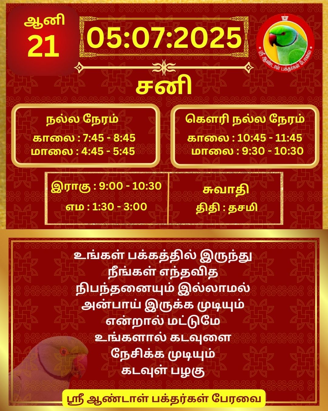 July 05 2025 0CommentSABP Posted by Vastu_Shastram In motivation SABPShare this: Tags: #daily_calender, APC, Calendar, calendar 2025, DAILY, DrAndalPChockalingam, Motivation, motivational quotes, motivational quotes daily, motivationalquotesoftheday, panjangam, SABP, SriAndalBakthargalPeravai, waytosuccess2025, ஆண்டாள், இன்றையநாள், காலண்டர், காலண்டர்2025, தன்னம்பிக்கை, தன்னம்பிக்கை2025, நாட்காட்டி, பஞ்சாங்கம், வாழ்கவளமுடன், ஸ்ரீஆண்டாள்பக்தர்கள்பேரவை Share: