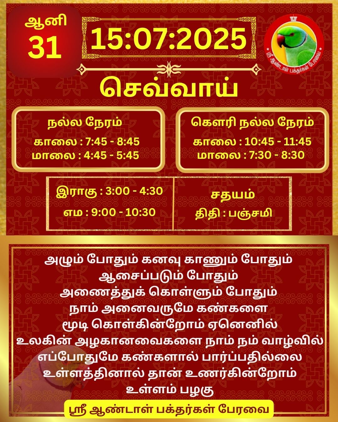 July 15 2025 0CommentSABP Posted by Vastu_Shastram In motivation SABPShare this: Tags: #daily_calender, APC, Calendar, calendar 2025, DAILY, DrAndalPChockalingam, Motivation, motivational quotes, motivational quotes daily, motivationalquotesoftheday, panjangam, SABP, SriAndalBakthargalPeravai, waytosuccess2025, ஆண்டாள், இன்றையநாள், காலண்டர், காலண்டர்2025, தன்னம்பிக்கை, தன்னம்பிக்கை2025, நாட்காட்டி, பஞ்சாங்கம், வாழ்கவளமுடன், ஸ்ரீஆண்டாள்பக்தர்கள்பேரவை Share: