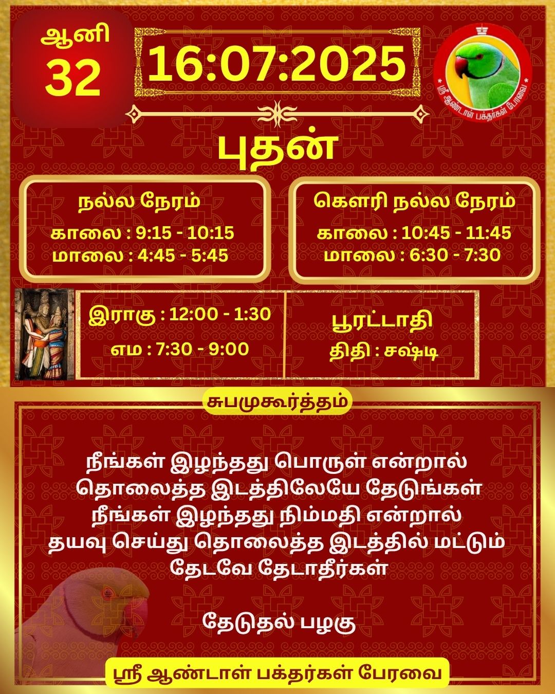 July 16 2025 0CommentSABP Posted by Vastu_Shastram In motivation SABPShare this: Tags: #daily_calender, APC, Calendar, calendar 2025, DAILY, DrAndalPChockalingam, Motivation, motivational quotes, motivational quotes daily, motivationalquotesoftheday, panjangam, SABP, SriAndalBakthargalPeravai, waytosuccess2025, ஆண்டாள், இன்றையநாள், காலண்டர், காலண்டர்2025, தன்னம்பிக்கை, தன்னம்பிக்கை2025, நாட்காட்டி, பஞ்சாங்கம், வாழ்கவளமுடன், ஸ்ரீஆண்டாள்பக்தர்கள்பேரவை Share: