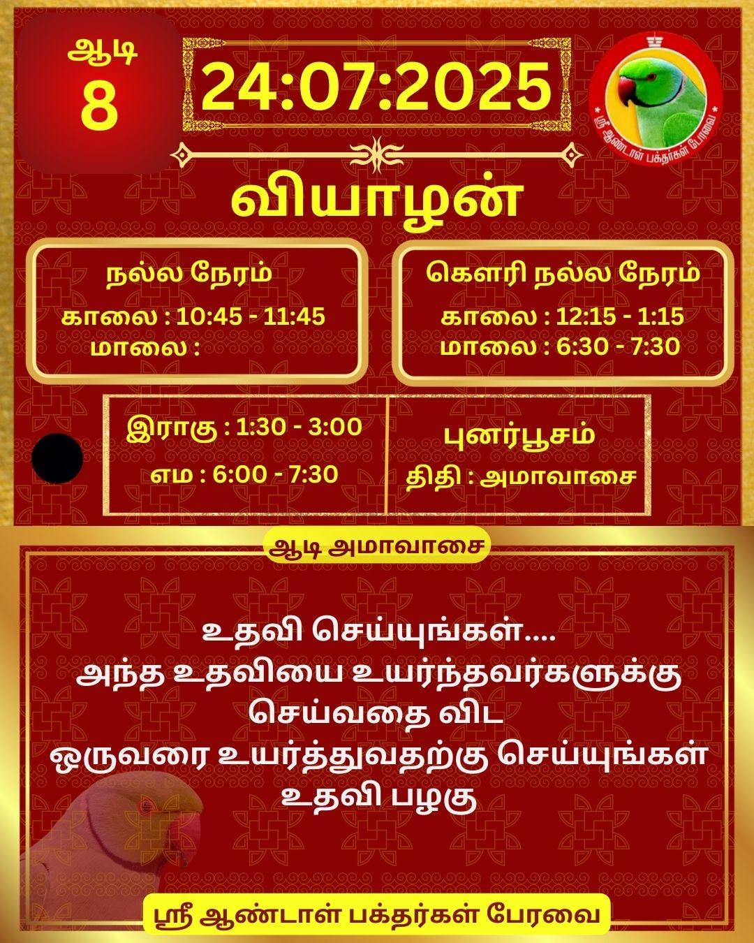 July 24 2025 0CommentSABP Posted by Vastu_Shastram In motivation SABPShare this: Tags: #daily_calender, APC, Calendar, calendar 2025, DAILY, DrAndalPChockalingam, Motivation, motivational quotes, motivational quotes daily, motivationalquotesoftheday, panjangam, SABP, SriAndalBakthargalPeravai, waytosuccess2025, ஆண்டாள், இன்றையநாள், காலண்டர், காலண்டர்2025, தன்னம்பிக்கை, தன்னம்பிக்கை2025, நாட்காட்டி, பஞ்சாங்கம், வாழ்கவளமுடன், ஸ்ரீஆண்டாள்பக்தர்கள்பேரவை Share: