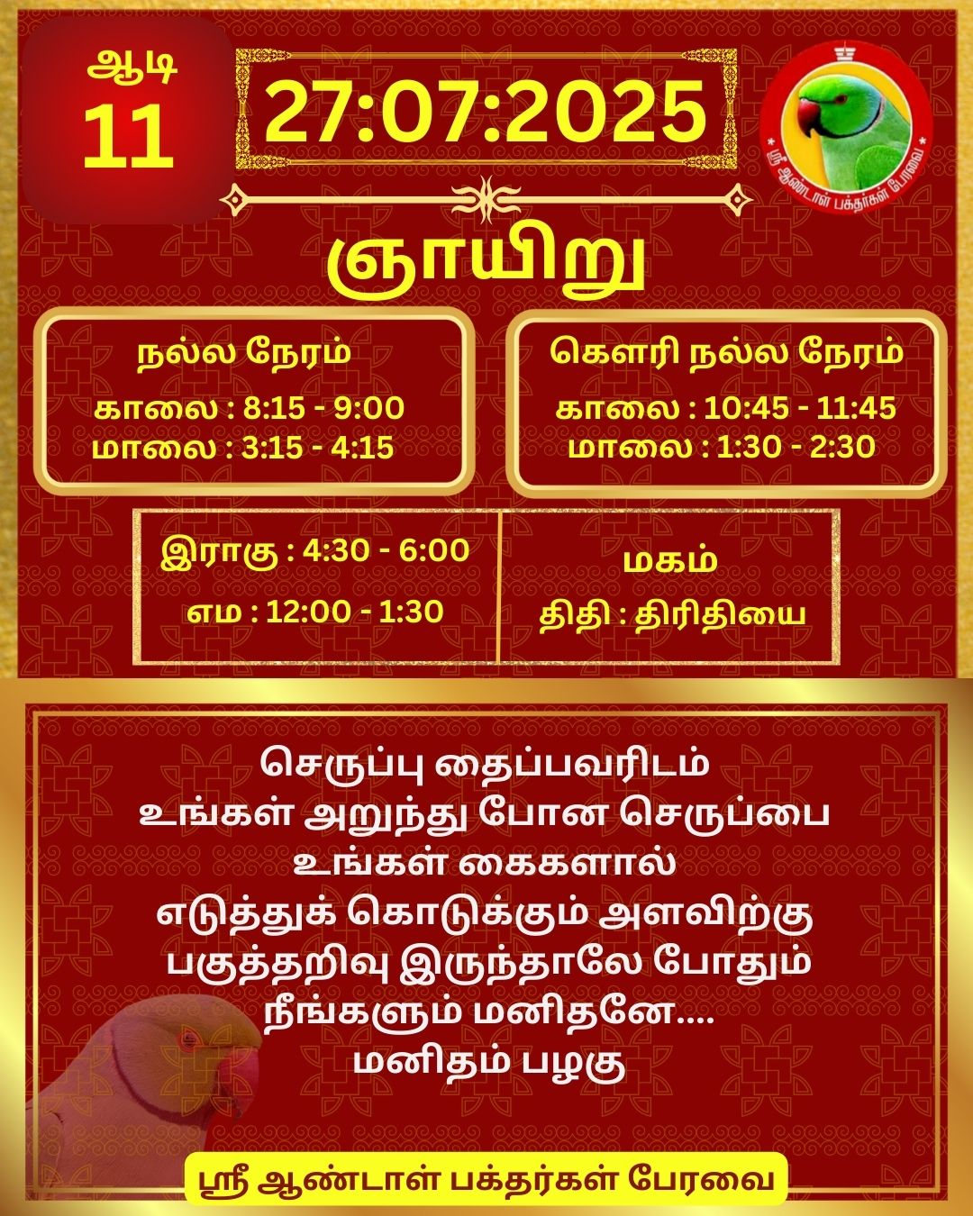 July 27 2025 0CommentSABP Posted by Vastu_Shastram In motivation SABPShare this: Tags: #daily_calender, APC, Calendar, calendar 2025, DAILY, DrAndalPChockalingam, Motivation, motivational quotes, motivational quotes daily, motivationalquotesoftheday, panjangam, SABP, SriAndalBakthargalPeravai, waytosuccess2025, ஆண்டாள், இன்றையநாள், காலண்டர், காலண்டர்2025, தன்னம்பிக்கை, தன்னம்பிக்கை2025, நாட்காட்டி, பஞ்சாங்கம், வாழ்கவளமுடன், ஸ்ரீஆண்டாள்பக்தர்கள்பேரவை Share: