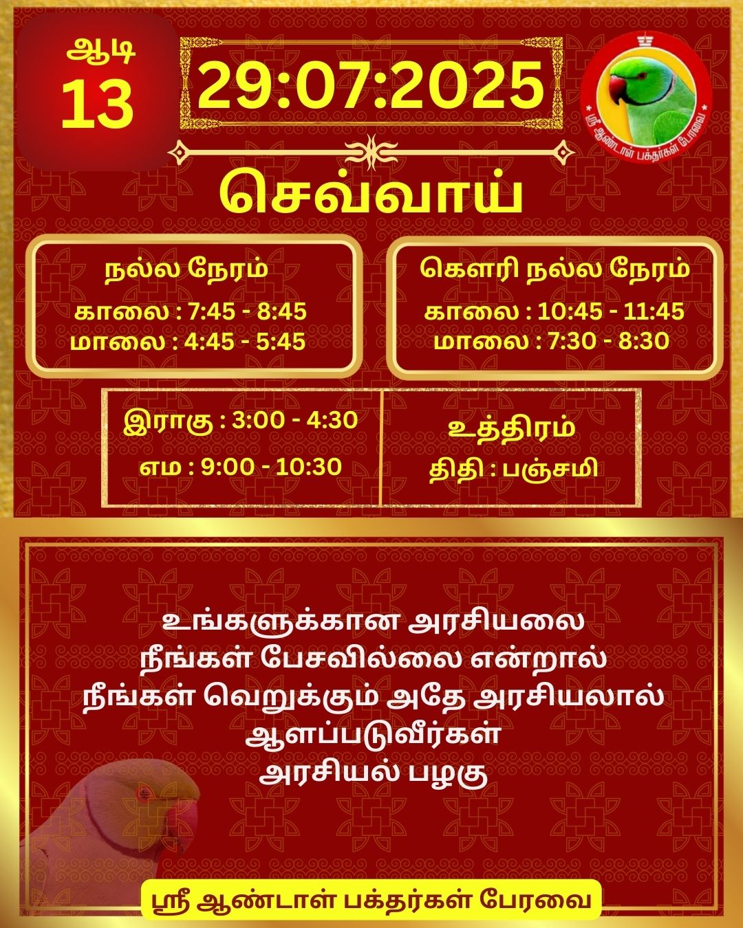 July 29 2025 0CommentSABP Posted by Vastu_Shastram In motivation SABPShare this: Tags: #daily_calender, APC, Calendar, calendar 2025, DAILY, DrAndalPChockalingam, Motivation, motivational quotes, motivational quotes daily, motivationalquotesoftheday, panjangam, SABP, SriAndalBakthargalPeravai, waytosuccess2025, ஆண்டாள், இன்றையநாள், காலண்டர், காலண்டர்2025, தன்னம்பிக்கை, தன்னம்பிக்கை2025, நாட்காட்டி, பஞ்சாங்கம், வாழ்கவளமுடன், ஸ்ரீஆண்டாள்பக்தர்கள்பேரவை Share: