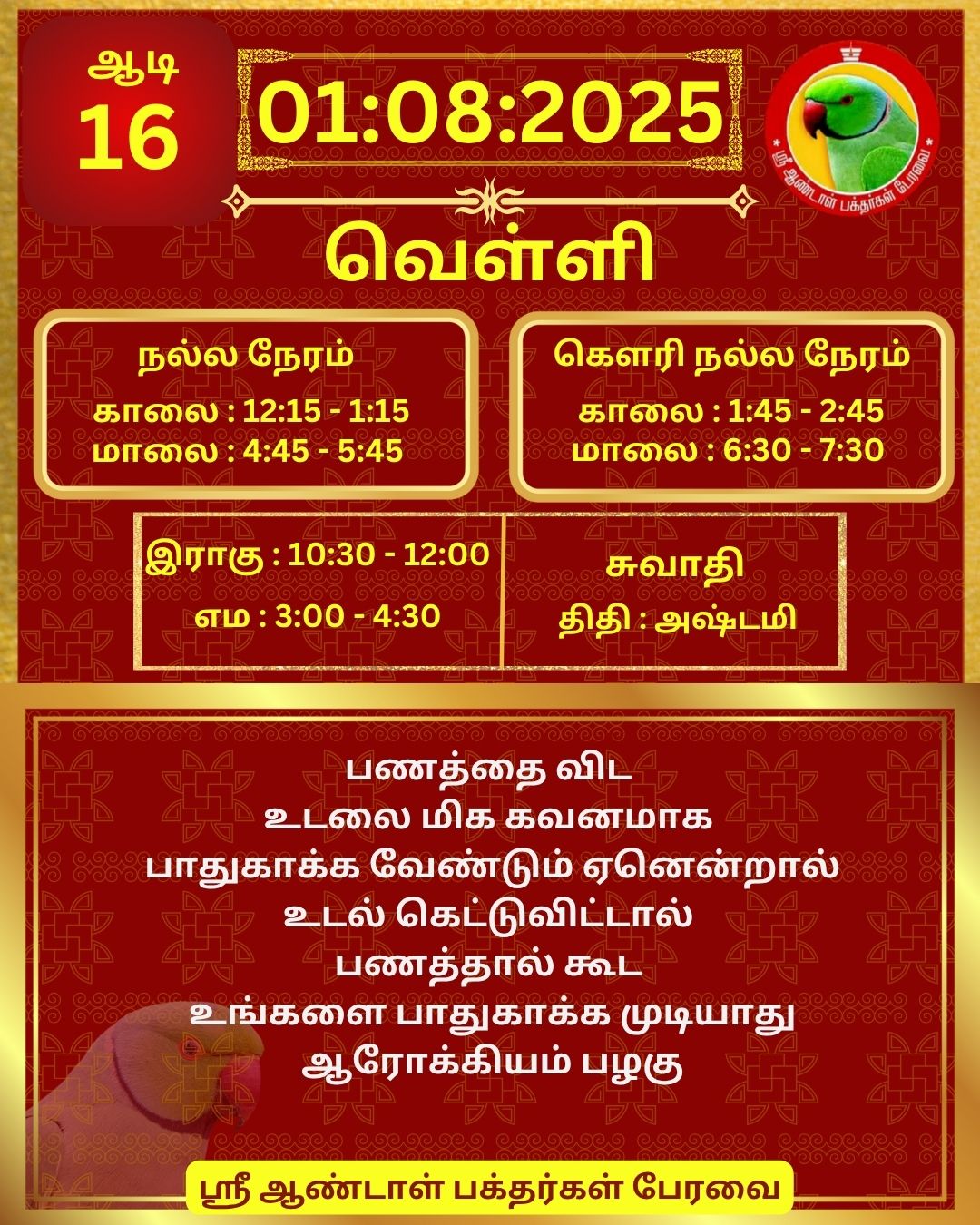 August 01 2025 0CommentSABP Posted by Vastu_Shastram In motivation SABPShare this: Tags: #daily_calender, APC, Calendar, calendar 2025, DAILY, DrAndalPChockalingam, Motivation, motivational quotes, motivational quotes daily, motivationalquotesoftheday, panjangam, SABP, SriAndalBakthargalPeravai, waytosuccess2025, ஆண்டாள், இன்றையநாள், காலண்டர், காலண்டர்2025, தன்னம்பிக்கை, தன்னம்பிக்கை2025, நாட்காட்டி, பஞ்சாங்கம், வாழ்கவளமுடன், ஸ்ரீஆண்டாள்பக்தர்கள்பேரவை Share: