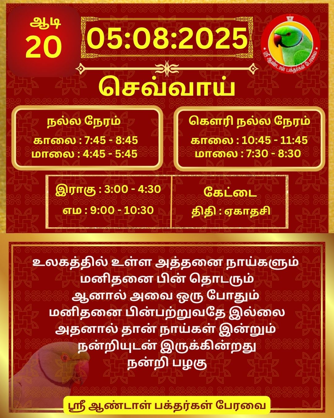 August 05 2025 0CommentSABP Posted by Vastu_Shastram In motivation SABPShare this: Tags: #daily_calender, APC, Calendar, calendar 2025, DAILY, DrAndalPChockalingam, Motivation, motivational quotes, motivational quotes daily, motivationalquotesoftheday, panjangam, SABP, SriAndalBakthargalPeravai, waytosuccess2025, ஆண்டாள், இன்றையநாள், காலண்டர், காலண்டர்2025, தன்னம்பிக்கை, தன்னம்பிக்கை2025, நாட்காட்டி, பஞ்சாங்கம், வாழ்கவளமுடன், ஸ்ரீஆண்டாள்பக்தர்கள்பேரவை Share: