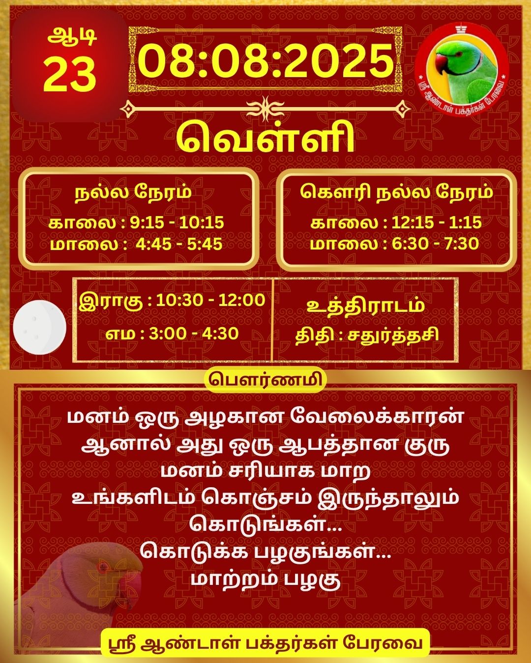 August 08 2025 0CommentSABP Posted by Vastu_Shastram In motivation SABPShare this: Tags: #daily_calender, APC, Calendar, calendar 2025, DAILY, DrAndalPChockalingam, Motivation, motivational quotes, motivational quotes daily, motivationalquotesoftheday, panjangam, SABP, SriAndalBakthargalPeravai, waytosuccess2025, ஆண்டாள், இன்றையநாள், காலண்டர், காலண்டர்2025, தன்னம்பிக்கை, தன்னம்பிக்கை2025, நாட்காட்டி, பஞ்சாங்கம், வாழ்கவளமுடன், ஸ்ரீஆண்டாள்பக்தர்கள்பேரவை Share: