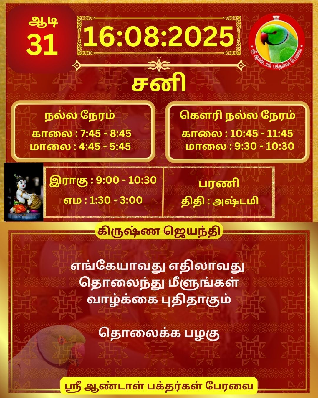 August 16 2025 0CommentSABP Posted by Vastu_Shastram In motivation SABPShare this: Tags: #daily_calender, APC, Calendar, calendar 2025, DAILY, DrAndalPChockalingam, Motivation, motivational quotes, motivational quotes daily, motivationalquotesoftheday, panjangam, SABP, SriAndalBakthargalPeravai, waytosuccess2025, ஆண்டாள், இன்றையநாள், காலண்டர், காலண்டர்2025, தன்னம்பிக்கை, தன்னம்பிக்கை2025, நாட்காட்டி, பஞ்சாங்கம், வாழ்கவளமுடன், ஸ்ரீஆண்டாள்பக்தர்கள்பேரவை Share: