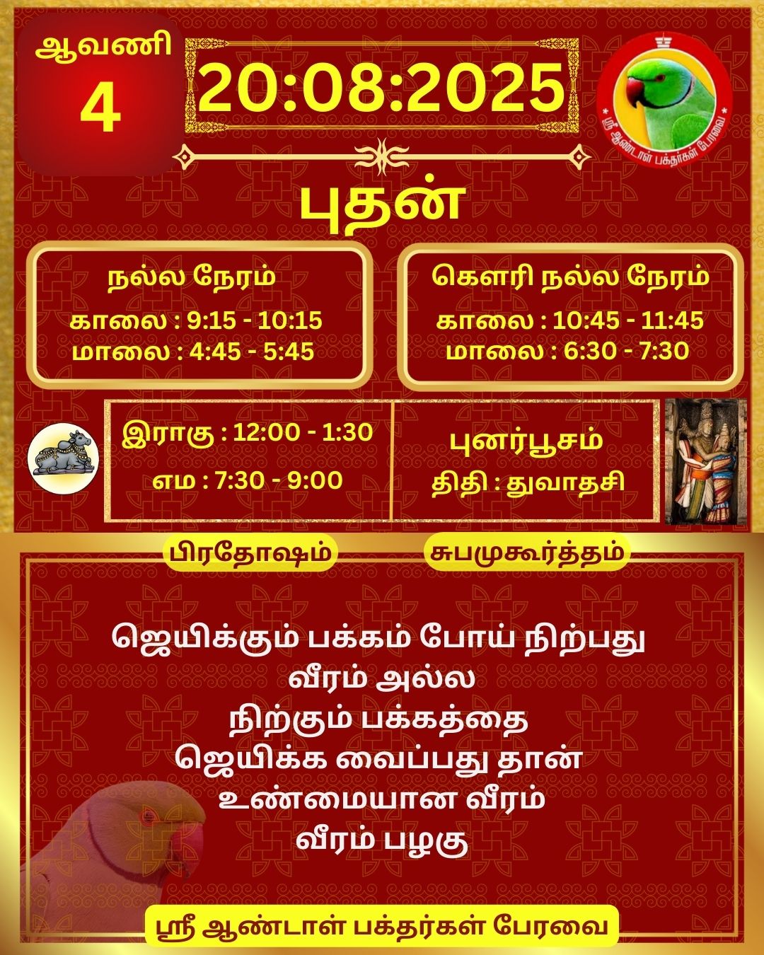 August 20 2025 0CommentSABP Posted by Vastu_Shastram In motivation SABPShare this: Tags: #daily_calender, APC, Calendar, calendar 2025, DAILY, DrAndalPChockalingam, Motivation, motivational quotes, motivational quotes daily, motivationalquotesoftheday, panjangam, SABP, SriAndalBakthargalPeravai, waytosuccess2025, ஆண்டாள், இன்றையநாள், காலண்டர், காலண்டர்2025, தன்னம்பிக்கை, தன்னம்பிக்கை2025, நாட்காட்டி, பஞ்சாங்கம், வாழ்கவளமுடன், ஸ்ரீஆண்டாள்பக்தர்கள்பேரவை Share: