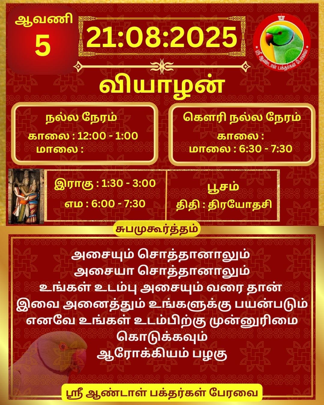 August 21 2025 0CommentSABP Posted by Vastu_Shastram In motivation SABPShare this: Tags: #daily_calender, APC, Calendar, calendar 2025, DAILY, DrAndalPChockalingam, Motivation, motivational quotes, motivational quotes daily, motivationalquotesoftheday, panjangam, SABP, SriAndalBakthargalPeravai, waytosuccess2025, ஆண்டாள், இன்றையநாள், காலண்டர், காலண்டர்2025, தன்னம்பிக்கை, தன்னம்பிக்கை2025, நாட்காட்டி, பஞ்சாங்கம், வாழ்கவளமுடன், ஸ்ரீஆண்டாள்பக்தர்கள்பேரவை Share: