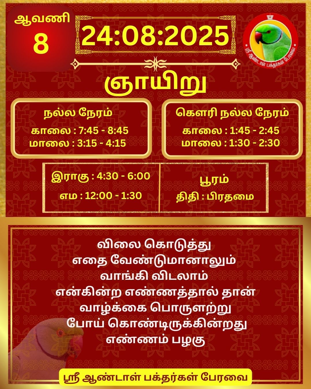 August 24 2025 0CommentSABP Posted by Vastu_Shastram In motivation SABPShare this: Tags: #daily_calender, APC, Calendar, calendar 2025, DAILY, DrAndalPChockalingam, Motivation, motivational quotes, motivational quotes daily, motivationalquotesoftheday, panjangam, SABP, SriAndalBakthargalPeravai, waytosuccess2025, ஆண்டாள், இன்றையநாள், காலண்டர், காலண்டர்2025, தன்னம்பிக்கை, தன்னம்பிக்கை2025, நாட்காட்டி, பஞ்சாங்கம், வாழ்கவளமுடன், ஸ்ரீஆண்டாள்பக்தர்கள்பேரவை Share: