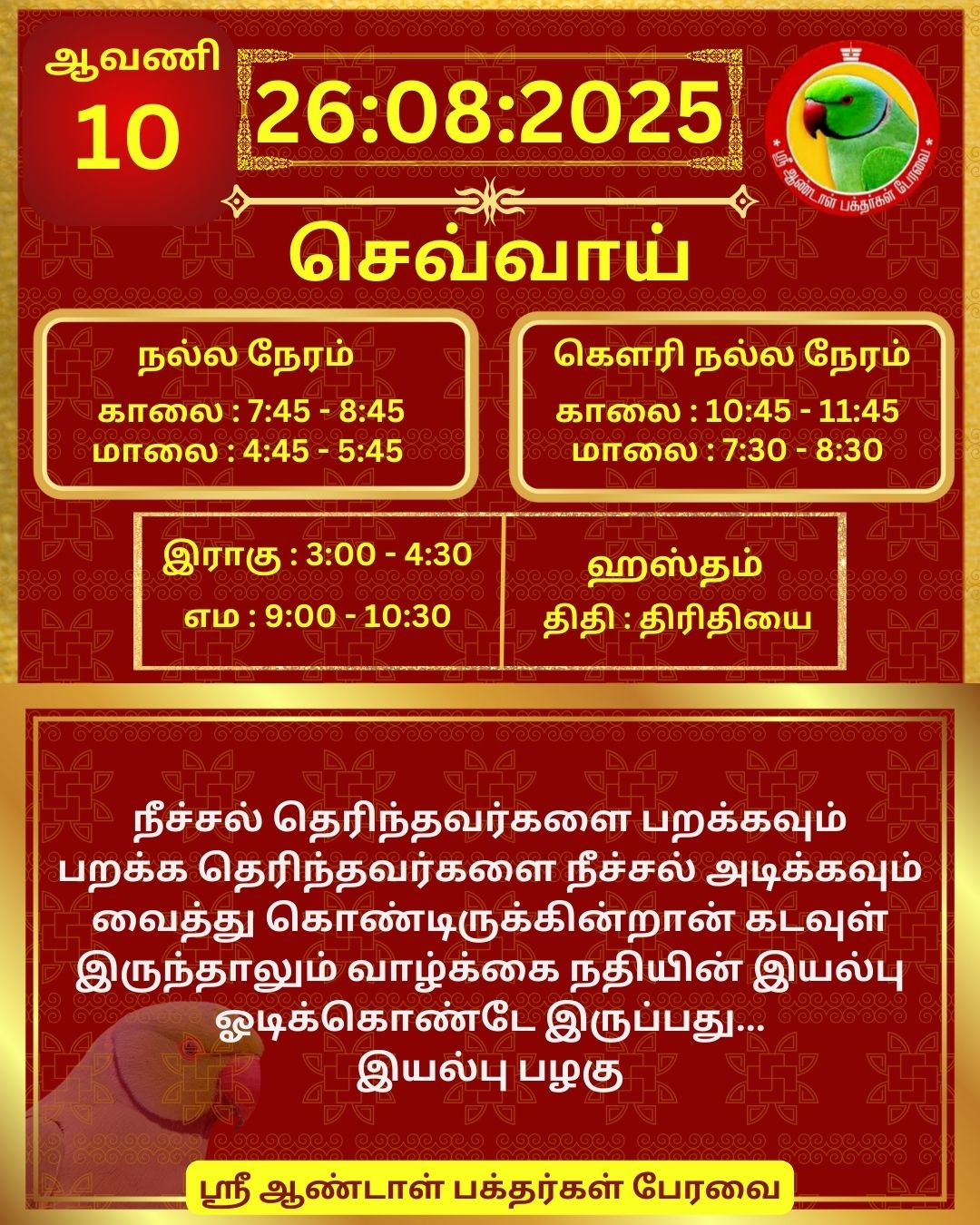 August 26 2025 0CommentSABP Posted by Vastu_Shastram In motivation SABPShare this: Tags: #daily_calender, APC, Calendar, calendar 2025, DAILY, DrAndalPChockalingam, Motivation, motivational quotes, motivational quotes daily, motivationalquotesoftheday, panjangam, SABP, SriAndalBakthargalPeravai, waytosuccess2025, ஆண்டாள், இன்றையநாள், காலண்டர், காலண்டர்2025, தன்னம்பிக்கை, தன்னம்பிக்கை2025, நாட்காட்டி, பஞ்சாங்கம், வாழ்கவளமுடன், ஸ்ரீஆண்டாள்பக்தர்கள்பேரவை Share: