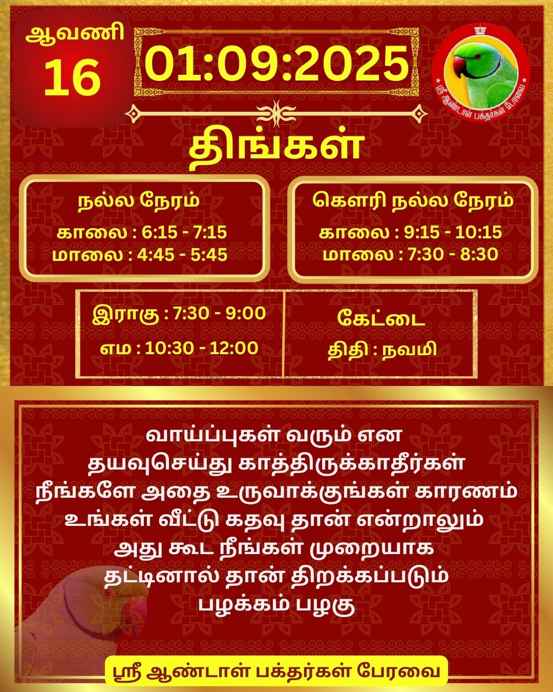 September 01 2025 0CommentSABP Posted by Vastu_Shastram In motivation SABPShare this: Tags: #daily_calender, APC, Calendar, calendar 2025, DAILY, DrAndalPChockalingam, Motivation, motivational quotes, motivational quotes daily, motivationalquotesoftheday, panjangam, SABP, SriAndalBakthargalPeravai, waytosuccess2025, ஆண்டாள், இன்றையநாள், காலண்டர், காலண்டர்2025, தன்னம்பிக்கை, தன்னம்பிக்கை2025, நாட்காட்டி, பஞ்சாங்கம், வாழ்கவளமுடன், ஸ்ரீஆண்டாள்பக்தர்கள்பேரவை Share:
