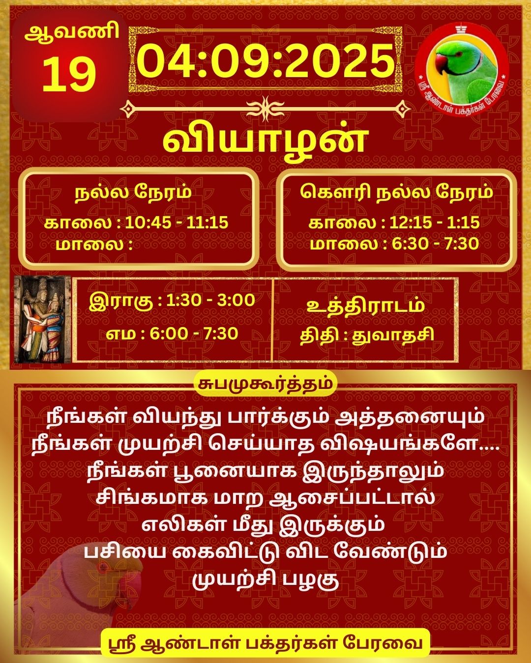 September 04 2025 0CommentSABP Posted by Vastu_Shastram In motivation SABP Share this: Tags: #daily_calender, APC, Calendar, calendar 2025, DAILY, DrAndalPChockalingam, Motivation, motivational quotes, motivational quotes daily, motivationalquotesoftheday, panjangam, SABP, SriAndalBakthargalPeravai, waytosuccess2025, ஆண்டாள், இன்றையநாள், காலண்டர், காலண்டர்2025, தன்னம்பிக்கை, தன்னம்பிக்கை2025, நாட்காட்டி, பஞ்சாங்கம், வாழ்கவளமுடன், ஸ்ரீஆண்டாள்பக்தர்கள்பேரவை Share: