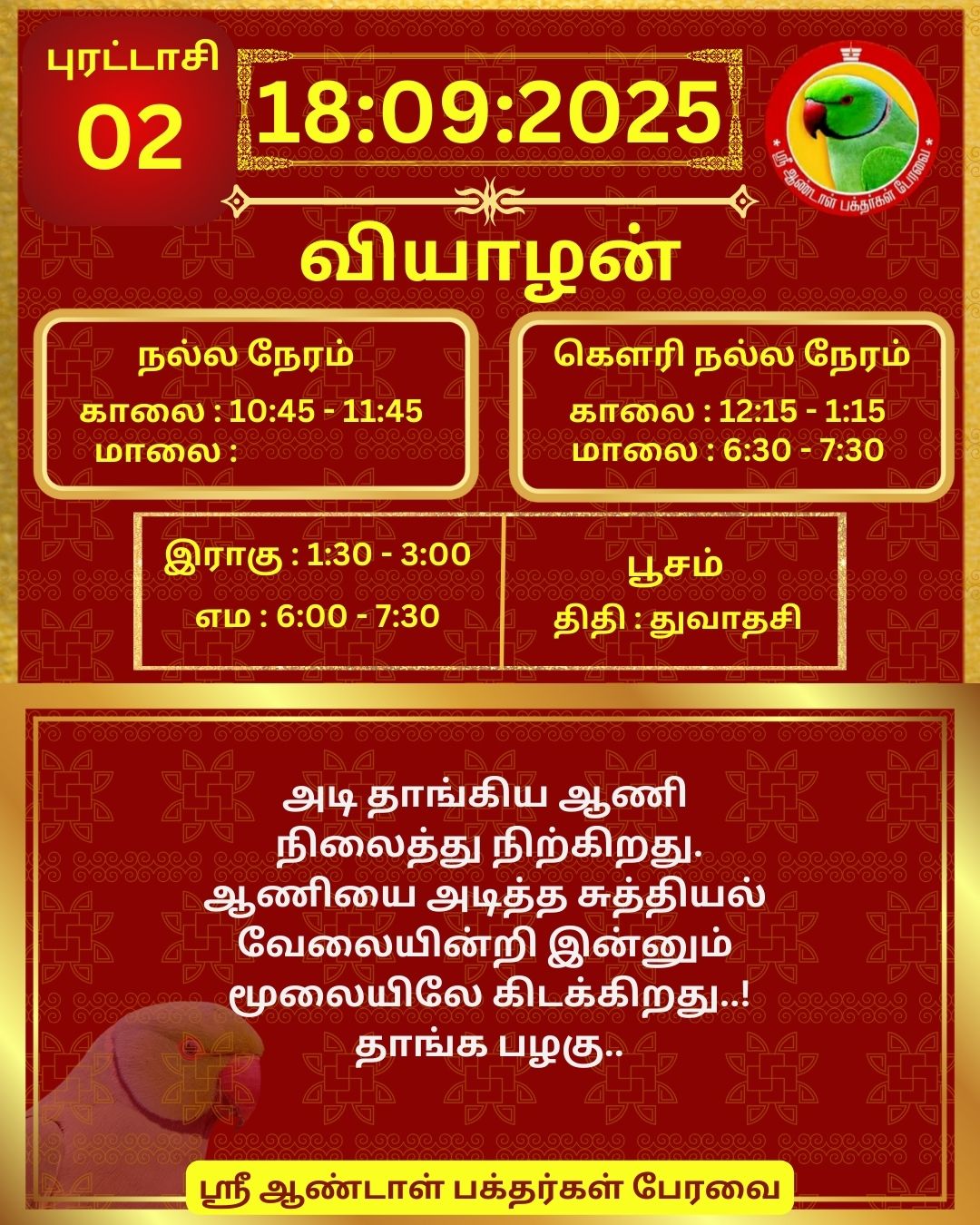 September 18 2025 0CommentSABP Posted by Vastu_Shastram In motivation SABPShare this: Tags: #daily_calender, APC, Calendar, calendar 2025, DAILY, DrAndalPChockalingam, Motivation, motivational quotes, motivational quotes daily, motivationalquotesoftheday, panjangam, SABP, SriAndalBakthargalPeravai, waytosuccess2025, ஆண்டாள், இன்றையநாள், காலண்டர், காலண்டர்2025, தன்னம்பிக்கை, தன்னம்பிக்கை2025, நாட்காட்டி, பஞ்சாங்கம், வாழ்கவளமுடன், ஸ்ரீஆண்டாள்பக்தர்கள்பேரவை Share: