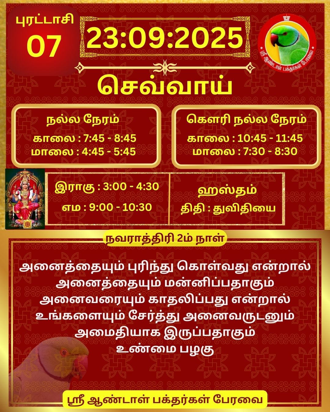 September 23 2025 0CommentSABP Posted by Vastu_Shastram In motivation SABPShare this: Tags: #daily_calender, APC, Calendar, calendar 2025, DAILY, DrAndalPChockalingam, Motivation, motivational quotes, motivational quotes daily, motivationalquotesoftheday, panjangam, SABP, SriAndalBakthargalPeravai, waytosuccess2025, ஆண்டாள், இன்றையநாள், காலண்டர், காலண்டர்2025, தன்னம்பிக்கை, தன்னம்பிக்கை2025, நாட்காட்டி, பஞ்சாங்கம், வாழ்கவளமுடன், ஸ்ரீஆண்டாள்பக்தர்கள்பேரவை Share: