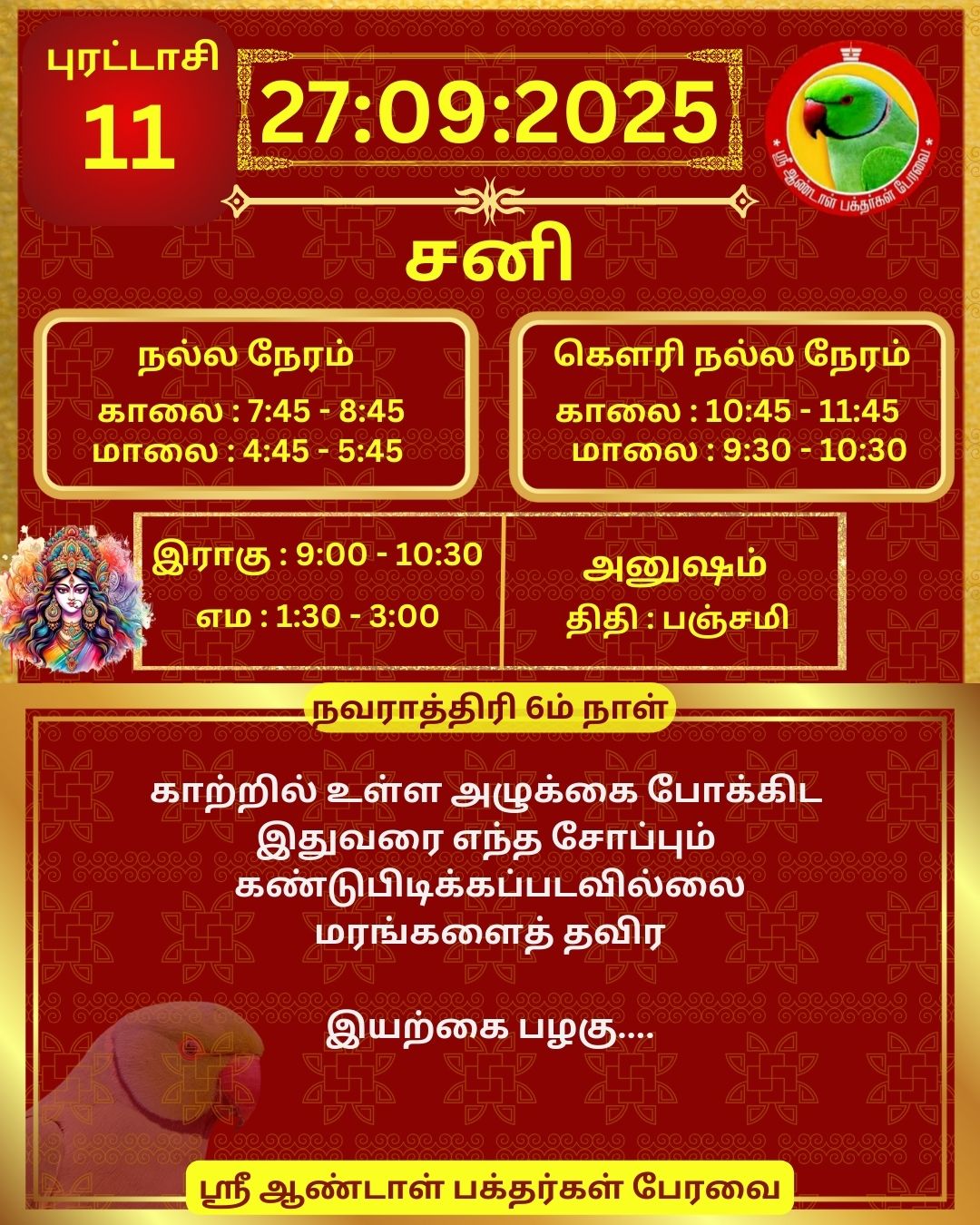 September 27 2025 0CommentSABP Posted by Vastu_Shastram In motivation SABPShare this: Tags: #daily_calender, APC, Calendar, calendar 2025, DAILY, DrAndalPChockalingam, Motivation, motivational quotes, motivational quotes daily, motivationalquotesoftheday, panjangam, SABP, SriAndalBakthargalPeravai, waytosuccess2025, ஆண்டாள், இன்றையநாள், காலண்டர், காலண்டர்2025, தன்னம்பிக்கை, தன்னம்பிக்கை2025, நாட்காட்டி, பஞ்சாங்கம், வாழ்கவளமுடன், ஸ்ரீஆண்டாள்பக்தர்கள்பேரவை Share: