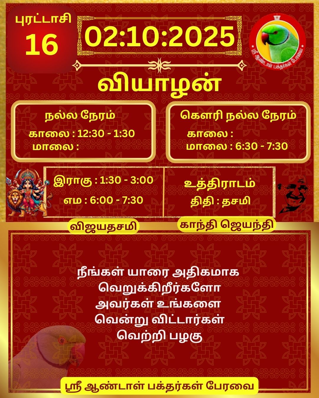 October 02 2025 0CommentSABP Posted by Vastu_Shastram In motivation SABPShare this: Tags: #daily_calender, APC, Calendar, calendar 2025, DAILY, DrAndalPChockalingam, Motivation, motivational quotes, motivational quotes daily, motivationalquotesoftheday, panjangam, SABP, SriAndalBakthargalPeravai, waytosuccess2025, ஆண்டாள், இன்றையநாள், காலண்டர், காலண்டர்2025, தன்னம்பிக்கை, தன்னம்பிக்கை2025, நாட்காட்டி, பஞ்சாங்கம், வாழ்கவளமுடன், ஸ்ரீஆண்டாள்பக்தர்கள்பேரவை Share: