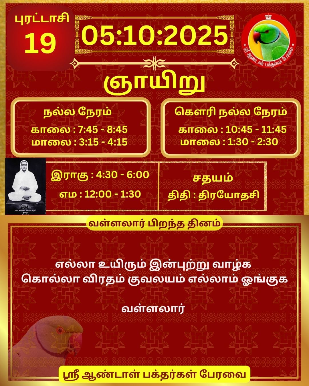 October 05 2025 0CommentSABP Posted by Vastu_Shastram In motivation SABPShare this: Tags: #daily_calender, APC, Calendar, calendar 2025, DAILY, DrAndalPChockalingam, Motivation, motivational quotes, motivational quotes daily, motivationalquotesoftheday, panjangam, SABP, SriAndalBakthargalPeravai, waytosuccess2025, ஆண்டாள், இன்றையநாள், காலண்டர், காலண்டர்2025, தன்னம்பிக்கை, தன்னம்பிக்கை2025, நாட்காட்டி, பஞ்சாங்கம், வாழ்கவளமுடன், ஸ்ரீஆண்டாள்பக்தர்கள்பேரவை Share: