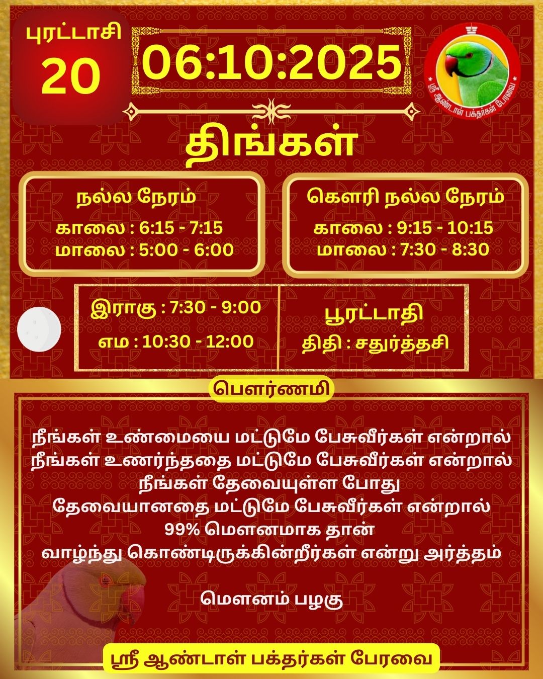 October 06 2025 0CommentSABP Posted by Vastu_Shastram In motivation SABPShare this: Tags: #daily_calender, APC, Calendar, calendar 2025, DAILY, DrAndalPChockalingam, Motivation, motivational quotes, motivational quotes daily, motivationalquotesoftheday, panjangam, SABP, SriAndalBakthargalPeravai, waytosuccess2025, ஆண்டாள், இன்றையநாள், காலண்டர், காலண்டர்2025, தன்னம்பிக்கை, தன்னம்பிக்கை2025, நாட்காட்டி, பஞ்சாங்கம், வாழ்கவளமுடன், ஸ்ரீஆண்டாள்பக்தர்கள்பேரவை Share: