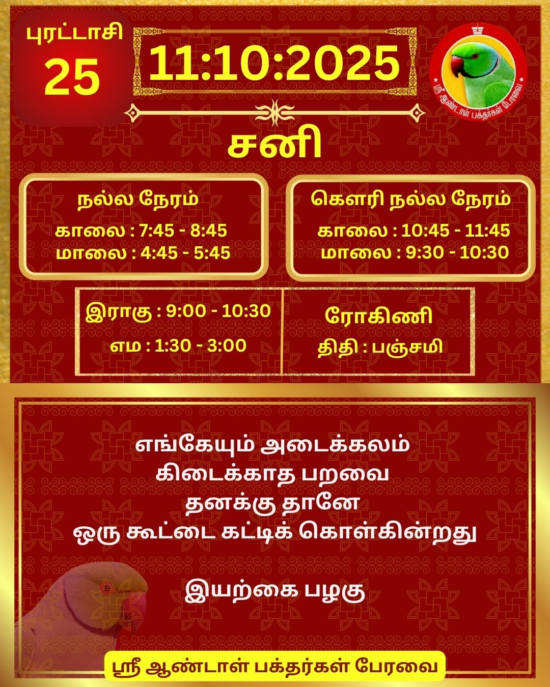 October 11 2025 0CommentSABP Posted by Vastu_Shastram In motivation SABPShare this: Tags: #daily_calender, APC, Calendar, calendar 2025, DAILY, DrAndalPChockalingam, Motivation, motivational quotes, motivational quotes daily, motivationalquotesoftheday, panjangam, SABP, SriAndalBakthargalPeravai, waytosuccess2025, ஆண்டாள், இன்றையநாள், காலண்டர், காலண்டர்2025, தன்னம்பிக்கை, தன்னம்பிக்கை2025, நாட்காட்டி, பஞ்சாங்கம், வாழ்கவளமுடன், ஸ்ரீஆண்டாள்பக்தர்கள்பேரவை Share: