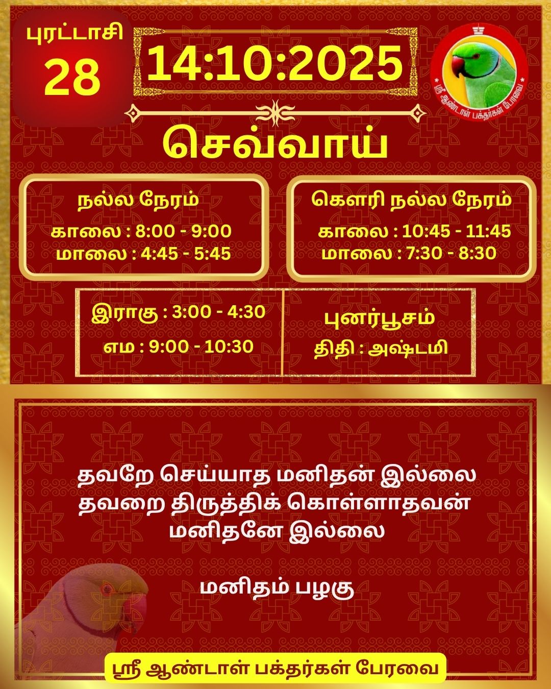 October 13 2025 0CommentSABP Posted by Vastu_Shastram In motivation SABPShare this: Tags: #daily_calender, APC, Calendar, calendar 2025, DAILY, DrAndalPChockalingam, Motivation, motivational quotes, motivational quotes daily, motivationalquotesoftheday, panjangam, SABP, SriAndalBakthargalPeravai, waytosuccess2025, ஆண்டாள், இன்றையநாள், காலண்டர், காலண்டர்2025, தன்னம்பிக்கை, தன்னம்பிக்கை2025, நாட்காட்டி, பஞ்சாங்கம், வாழ்கவளமுடன், ஸ்ரீஆண்டாள்பக்தர்கள்பேரவை Share: