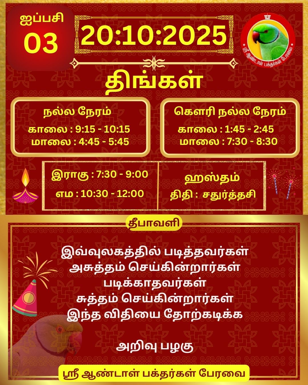 October 20 2025 0CommentSABP Posted by Vastu_Shastram In motivation SABPShare this: Tags: #daily_calender, APC, Calendar, calendar 2025, DAILY, DrAndalPChockalingam, Motivation, motivational quotes, motivational quotes daily, motivationalquotesoftheday, panjangam, SABP, SriAndalBakthargalPeravai, waytosuccess2025, ஆண்டாள், இன்றையநாள், காலண்டர், காலண்டர்2025, தன்னம்பிக்கை, தன்னம்பிக்கை2025, நாட்காட்டி, பஞ்சாங்கம், வாழ்கவளமுடன், ஸ்ரீஆண்டாள்பக்தர்கள்பேரவை Share: