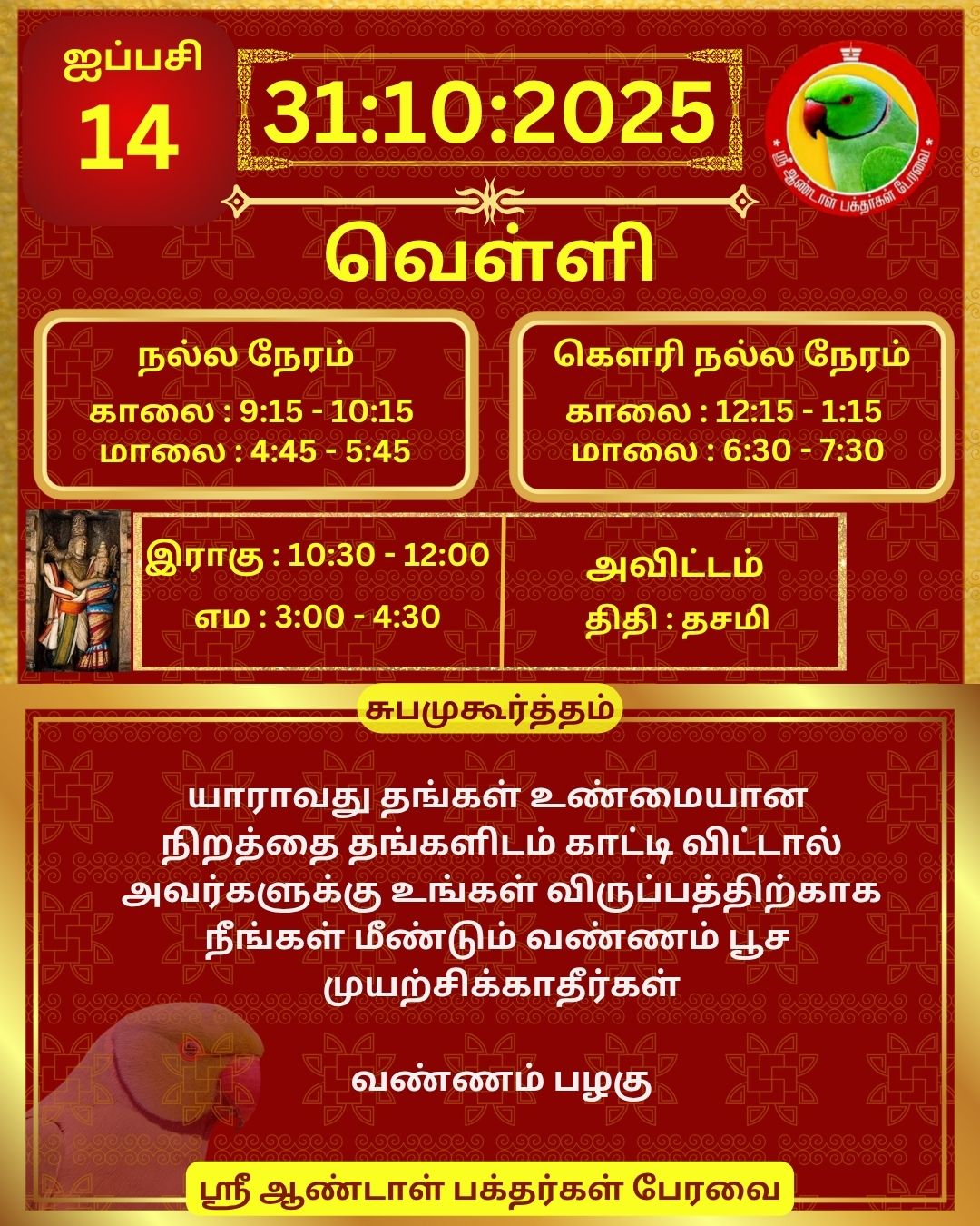 October 31 2025 0CommentSABP Posted by Vastu_Shastram In motivation SABPShare this: Tags: #daily_calender, APC, Calendar, calendar 2025, DAILY, DrAndalPChockalingam, Motivation, motivational quotes, motivational quotes daily, motivationalquotesoftheday, panjangam, SABP, SriAndalBakthargalPeravai, waytosuccess2025, ஆண்டாள், இன்றையநாள், காலண்டர், காலண்டர்2025, தன்னம்பிக்கை, தன்னம்பிக்கை2025, நாட்காட்டி, பஞ்சாங்கம், வாழ்கவளமுடன், ஸ்ரீஆண்டாள்பக்தர்கள்பேரவை Share: