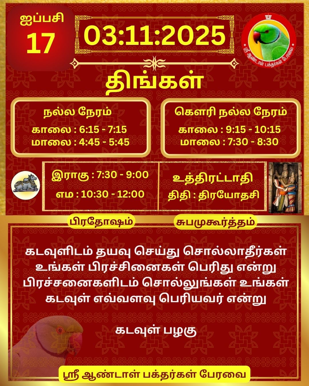 November 03 2025 0CommentSABP Posted by Vastu_Shastram In motivation SABPShare this: Tags: #daily_calender, APC, Calendar, calendar 2025, DAILY, DrAndalPChockalingam, Motivation, motivational quotes, motivational quotes daily, motivationalquotesoftheday, panjangam, SABP, SriAndalBakthargalPeravai, waytosuccess2025, ஆண்டாள், இன்றையநாள், காலண்டர், காலண்டர்2025, தன்னம்பிக்கை, தன்னம்பிக்கை2025, நாட்காட்டி, பஞ்சாங்கம், வாழ்கவளமுடன், ஸ்ரீஆண்டாள்பக்தர்கள்பேரவை Share: