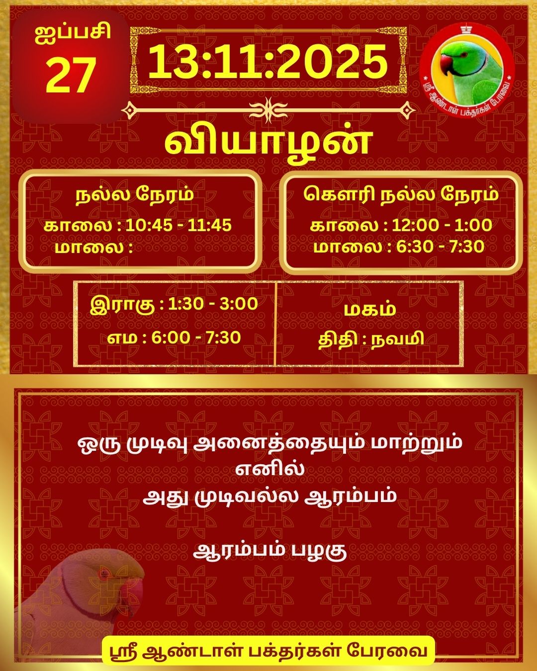 November 13 2025 0CommentSABP Posted by Vastu_Shastram In motivation SABPShare this: Tags: #daily_calender, APC, Calendar, calendar 2025, DAILY, DrAndalPChockalingam, Motivation, motivational quotes, motivational quotes daily, motivationalquotesoftheday, panjangam, SABP, SriAndalBakthargalPeravai, waytosuccess2025, ஆண்டாள், இன்றையநாள், காலண்டர், காலண்டர்2025, தன்னம்பிக்கை, தன்னம்பிக்கை2025, நாட்காட்டி, பஞ்சாங்கம், வாழ்கவளமுடன், ஸ்ரீஆண்டாள்பக்தர்கள்பேரவை Share:
