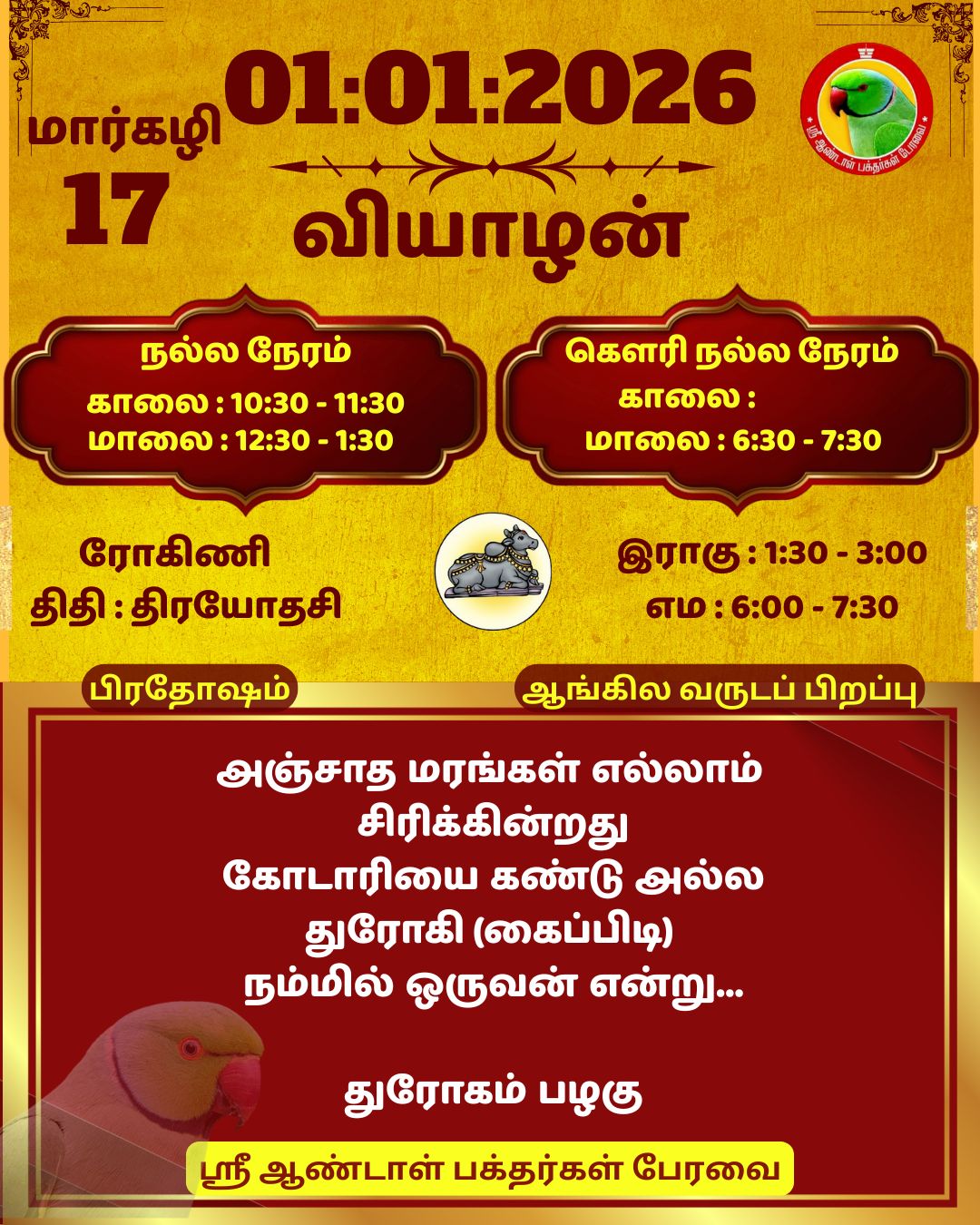 January 01 2026 0CommentSABP Posted by Vastu_Shastram In motivation SABPShare this: Tags: #daily_calender, APC, Calendar, calendar 2025, DAILY, DrAndalPChockalingam, Motivation, motivational quotes, motivational quotes daily, motivationalquotesoftheday, panjangam, SABP, SriAndalBakthargalPeravai, waytosuccess2025, ஆண்டாள், இன்றையநாள், காலண்டர், காலண்டர்2025, தன்னம்பிக்கை, தன்னம்பிக்கை2025, நாட்காட்டி, பஞ்சாங்கம், வாழ்கவளமுடன், ஸ்ரீஆண்டாள்பக்தர்கள்பேரவை Share: