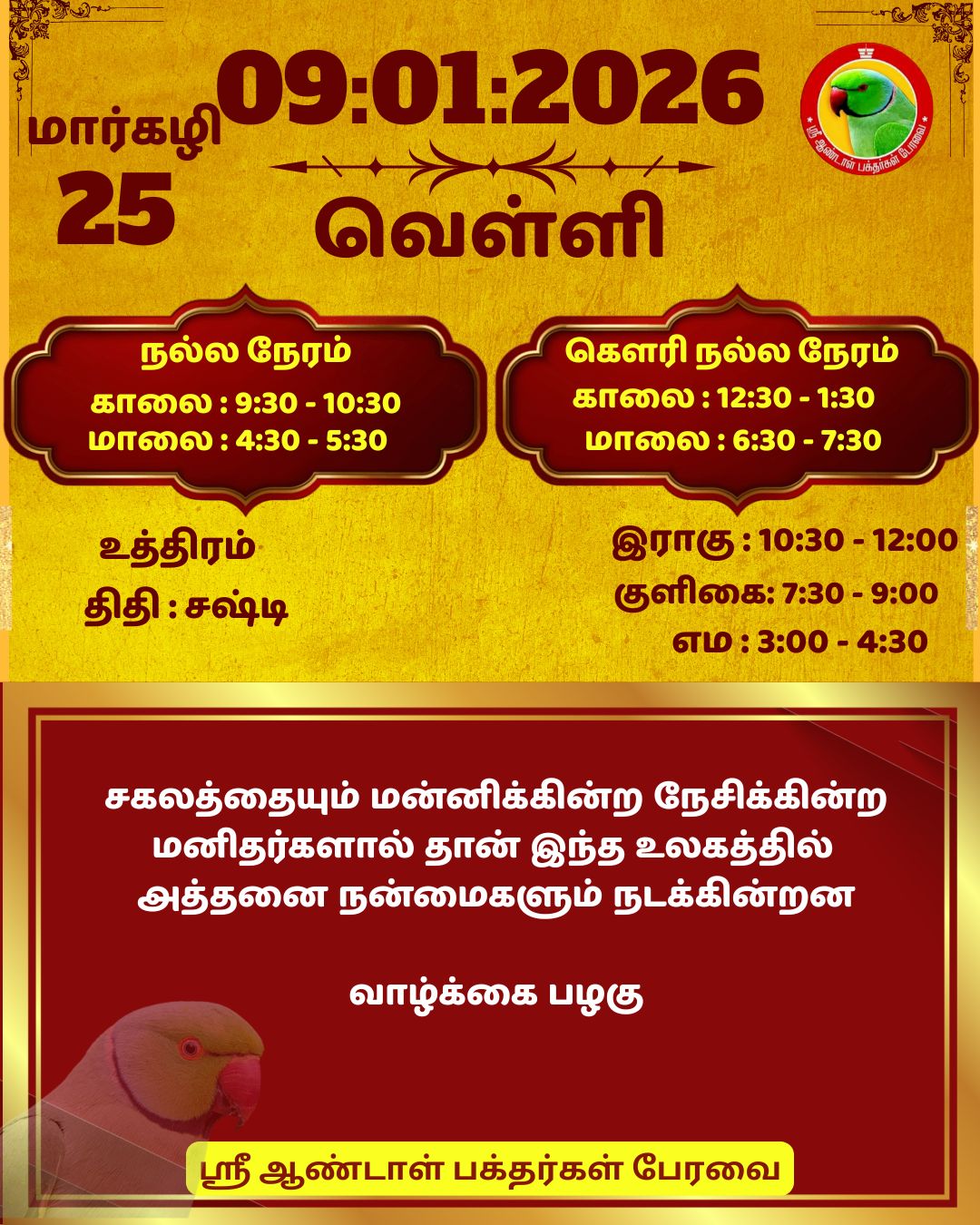January 09 2026 0CommentSABP Posted by Vastu_Shastram In motivation SABP Share this: Tags: #daily_calender, APC, Calendar, calendar 2025, DAILY, DrAndalPChockalingam, Motivation, motivational quotes, motivational quotes daily, motivationalquotesoftheday, panjangam, SABP, SriAndalBakthargalPeravai, waytosuccess2025, ஆண்டாள், இன்றையநாள், காலண்டர், காலண்டர்2025, தன்னம்பிக்கை, தன்னம்பிக்கை2025, நாட்காட்டி, பஞ்சாங்கம், வாழ்கவளமுடன், ஸ்ரீஆண்டாள்பக்தர்கள்பேரவை Share: