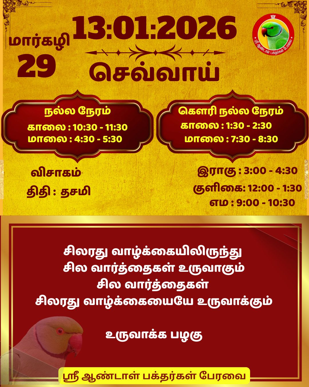 January 13 2026 0CommentSABP Posted by Vastu_Shastram In motivation SABPShare this: Tags: #daily_calender, APC, Calendar, calendar 2025, DAILY, DrAndalPChockalingam, Motivation, motivational quotes, motivational quotes daily, motivationalquotesoftheday, panjangam, SABP, SriAndalBakthargalPeravai, waytosuccess2025, ஆண்டாள், இன்றையநாள், காலண்டர், காலண்டர்2025, தன்னம்பிக்கை, தன்னம்பிக்கை2025, நாட்காட்டி, பஞ்சாங்கம், வாழ்கவளமுடன், ஸ்ரீஆண்டாள்பக்தர்கள்பேரவை Share: