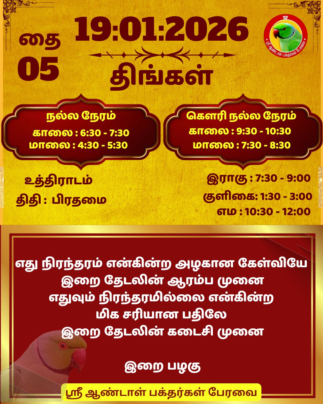 January 19 2026 0CommentSABP Posted by Vastu_Shastram In motivation SABPShare this: Tags: #daily_calender, APC, Calendar, calendar 2025, DAILY, DrAndalPChockalingam, Motivation, motivational quotes, motivational quotes daily, motivationalquotesoftheday, panjangam, SABP, SriAndalBakthargalPeravai, waytosuccess2025, ஆண்டாள், இன்றையநாள், காலண்டர், காலண்டர்2025, தன்னம்பிக்கை, தன்னம்பிக்கை2025, நாட்காட்டி, பஞ்சாங்கம், வாழ்கவளமுடன், ஸ்ரீஆண்டாள்பக்தர்கள்பேரவை Share: