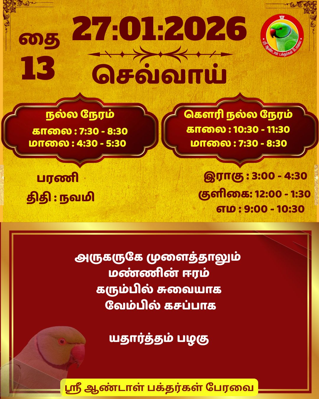 January 27 2026 0CommentSABP Posted by Vastu_Shastram In motivation SABPShare this: Tags: #daily_calender, APC, Calendar, calendar 2025, DAILY, DrAndalPChockalingam, Motivation, motivational quotes, motivational quotes daily, motivationalquotesoftheday, panjangam, SABP, SriAndalBakthargalPeravai, waytosuccess2025, ஆண்டாள், இன்றையநாள், காலண்டர், காலண்டர்2025, தன்னம்பிக்கை, தன்னம்பிக்கை2025, நாட்காட்டி, பஞ்சாங்கம், வாழ்கவளமுடன், ஸ்ரீஆண்டாள்பக்தர்கள்பேரவை Share: