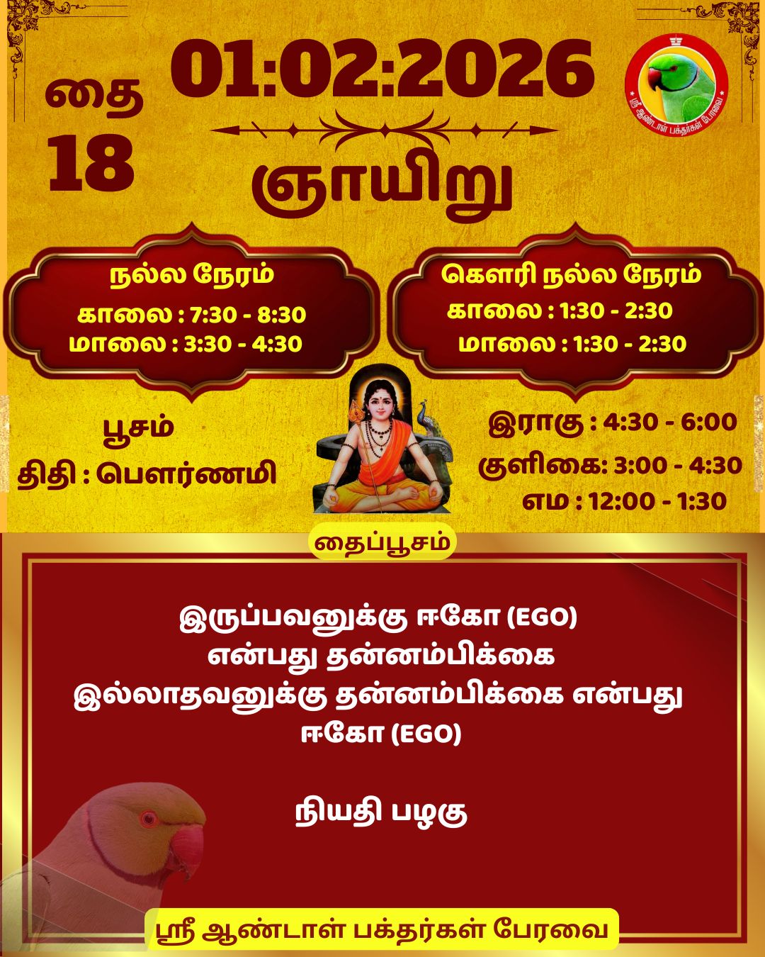 February 01 2026 0CommentSABP Posted by Vastu_Shastram In motivation SABPShare this: Tags: #daily_calender, APC, Calendar, calendar 2025, DAILY, DrAndalPChockalingam, Motivation, motivational quotes, motivational quotes daily, motivationalquotesoftheday, panjangam, SABP, SriAndalBakthargalPeravai, waytosuccess2025, ஆண்டாள், இன்றையநாள், காலண்டர், காலண்டர்2025, தன்னம்பிக்கை, தன்னம்பிக்கை2025, நாட்காட்டி, பஞ்சாங்கம், வாழ்கவளமுடன், ஸ்ரீஆண்டாள்பக்தர்கள்பேரவை Share: